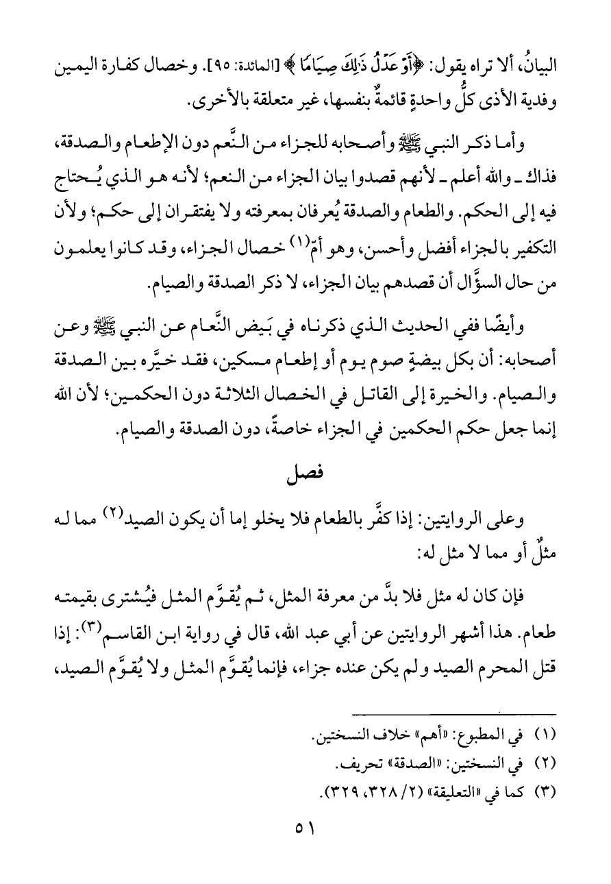 وأما ذكر النبي - صلى الله عليه وسلم - وأصحابه للجزاء من النَّعم دون الإطعام والصدقة، فذاك ــ والله أعلم ــ لأنهم قصدوا بيان الجزاء من النعم؛ لأنه هو الذي يُحتاج فيه إلى الحكم. والطعام والصدقة يُعرفان بمعرفته ولا يفتقران إلى حكم؛ ولأن التكفير بالجزاء أفضل وأحسن، وهو أمّ (¬١) خصال الجزاء، وقد كانوا يعلمون من حال السؤَّال أن قصدهم بيان الجزاء، لا ذكر الصدقة والصيام.