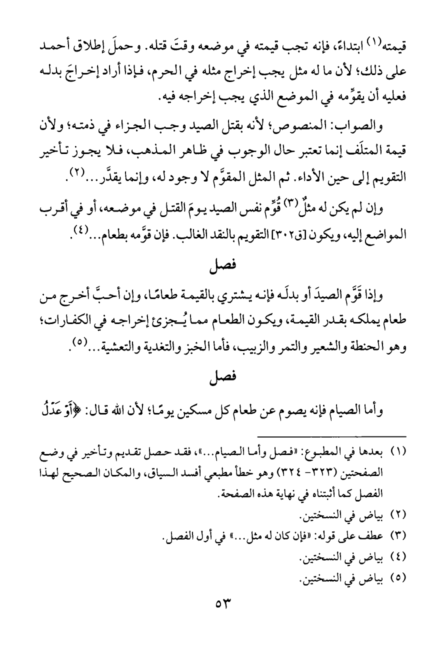 (¬١) بعدها في المطبوع: «فصل وأما الصيام ... »، فقد حصل تقديم وتأخير في وضع الصفحتين (٣٢٣ - ٣٢٤) وهو خطأ مطبعي أفسد السياق، والمكان الصحيح لهذا الفصل كما أثبتناه في نهاية هذه الصفحة.