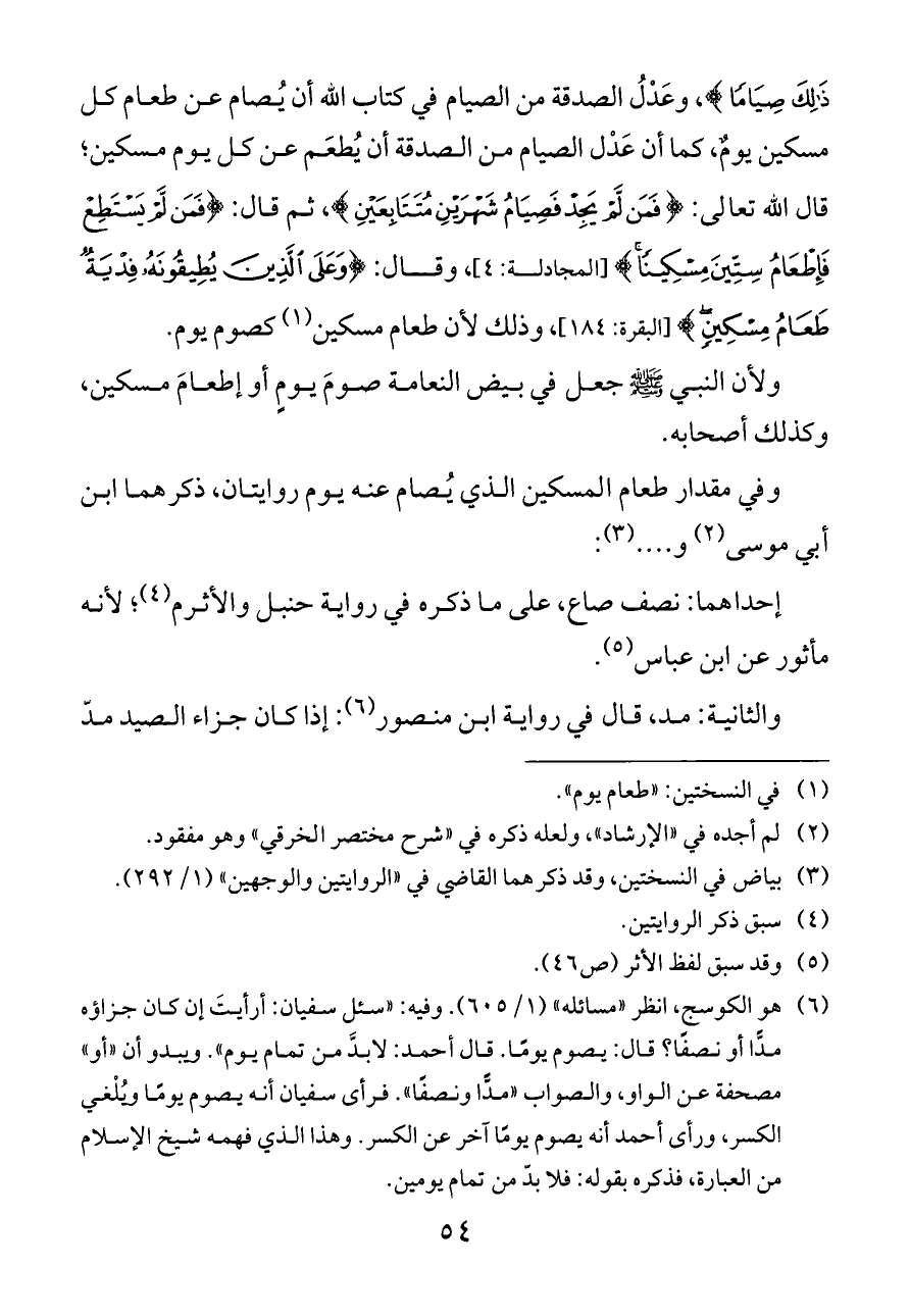 (¬٦) هو الكوسج، انظر «مسائله» (١/ ٦٠٥). وفيه: «سئل سفيان: أرأيتَ إن كان جزاؤه مدًّا أو نصفًا؟ قال: يصوم يومًا. قال أحمد: لابدَّ من تمام يوم». ويبدو أن «أو» مصحفة عن الواو، والصواب «مدًّا ونصفًا». فرأى سفيان أنه يصوم يومًا ويُلْغي الكسر، ورأى أحمد أنه يصوم يومًا آخر عن الكسر. وهذا الذي فهمه شيخ الإسلام من العبارة، فذكره بقوله: فلا بدّ من تمام يومين.