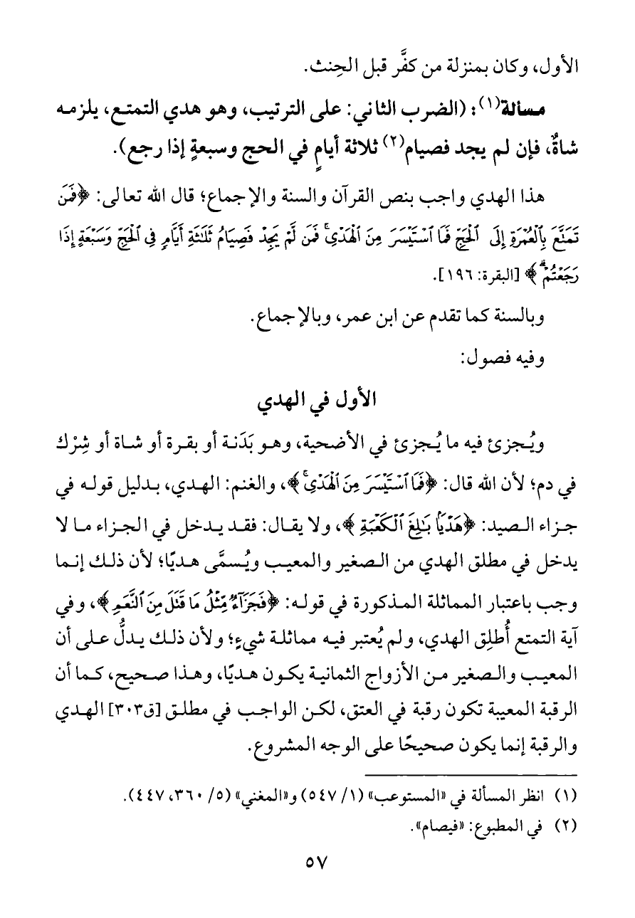 هذا الهدي واجب بنص القرآن والسنة والإجماع؛ قال الله تعالى: {فَمَنْ تَمَتَّعَ بِالْعُمْرَةِ إِلَى الْحَجِّ فَمَا اسْتَيْسَرَ مِنَ الْهَدْيِ فَمَنْ لَمْ يَجِدْ فَصِيَامُ ثَلَاثَةِ أَيَّامٍ فِي الْحَجِّ وَسَبْعَةٍ إِذَا رَجَعْتُمْ} [البقرة: ١٩٦].