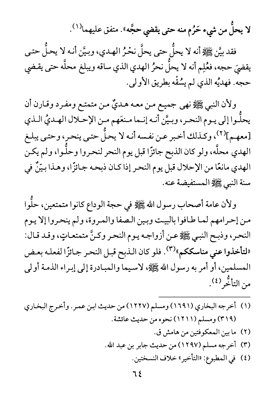 فقد بيَّن - صلى الله عليه وسلم - أنه لا يحلُّ حتى يحلَّ نحْرُ الهدي، وبيَّن أنه لا يحلُّ حتى يقضيَ حجه، فعُلِم أنه لا يحلُّ نحرُ الهدي الذي ساقه ويبلغ محلَّه حتى يقضي حجه. فهديُه الذي لم يسُقْه بطريق الأولى.