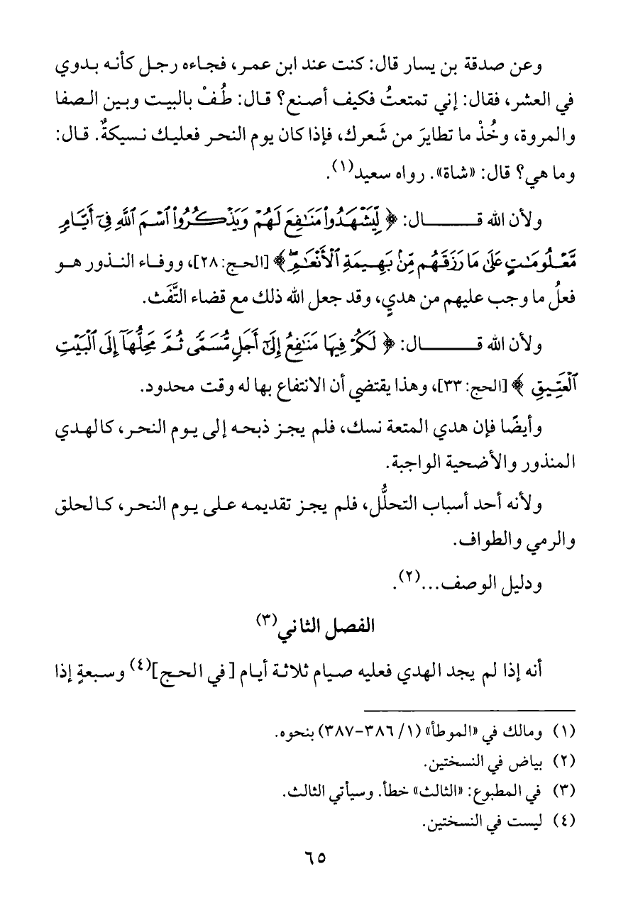 ولأن الله قال: {لِيَشْهَدُوا مَنَافِعَ لَهُمْ وَيَذْكُرُوا اسْمَ اللَّهِ فِي أَيَّامٍ مَعْلُومَاتٍ عَلَى مَا رَزَقَهُمْ مِنْ بَهِيمَةِ الْأَنْعَامِ} [الحج: ٢٨]، ووفاء النذور هو فعلُ ما وجب عليهم من هديٍ، وقد جعل الله ذلك مع قضاء التَّفَث.