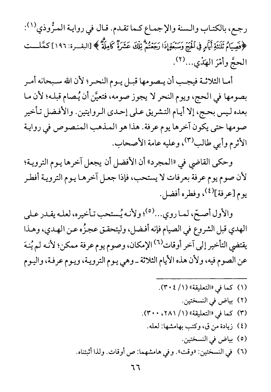 أما الثلاثة فيجب أن يصومها قبل يوم النحر؛ لأن الله سبحانه أمر بصومها في الحج، ويوم النحر لا يجوز صومه، فتعيَّن أن يُصام قبله؛ لأن ما بعده ليس بحج، إلا أيام التشريق على إحدى الروايتين. والأفضل تأخير صومها حتى يكون آخرها يوم عرفة. هذا هو المذهب المنصوص في رواية الأثرم وأبي طالب (¬٣)، وعليه عامة الأصحاب.