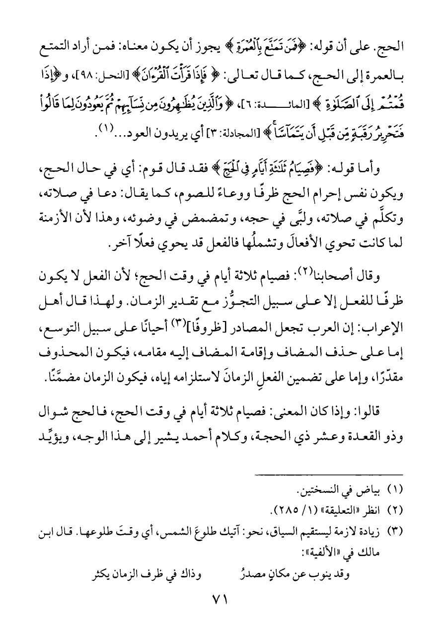 قالوا: وإذا كان المعنى: فصيام ثلاثة أيام في وقت الحج، فالحج شوال وذو القعدة وعشر ذي الحجة، وكلام أحمد يشير إلى هذا الوجه، ويؤيِّد