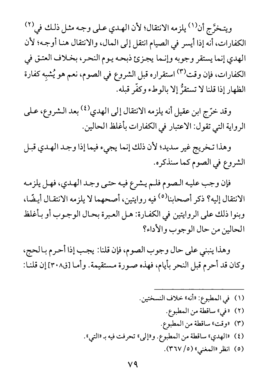 فإن وجب عليه الصوم فلم يشرع فيه حتى وجد الهدي، فهل يلزمه الانتقال إليه؟ ذكر أصحابنا (¬٥) فيه روايتين، أصحهما لا يلزمه الانتقال أيضًا، وبنوا ذلك على الروايتين في الكفارة: هل العبرة بحال الوجوب أو بأغلظ الحالين من حال الوجوب والأداء؟