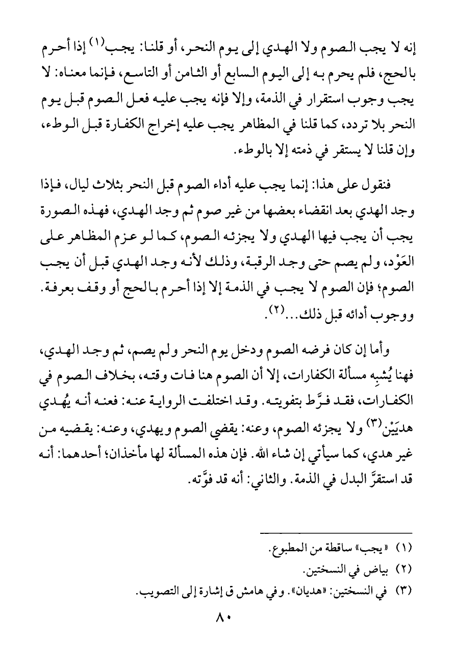 إنه لا يجب الصوم ولا الهدي إلى يوم النحر، أو قلنا: يجب (¬١) إذا أحرم بالحج، فلم يحرم به إلى اليوم السابع أو الثامن أو التاسع، فإنما معناه: لا يجب وجوب استقرار في الذمة، وإلا فإنه يجب عليه فعل الصوم قبل يوم النحر بلا تردد، كما قلنا في المظاهر يجب عليه إخراج الكفارة قبل الوطء، وإن قلنا لا يستقر في ذمته إلا بالوطء.