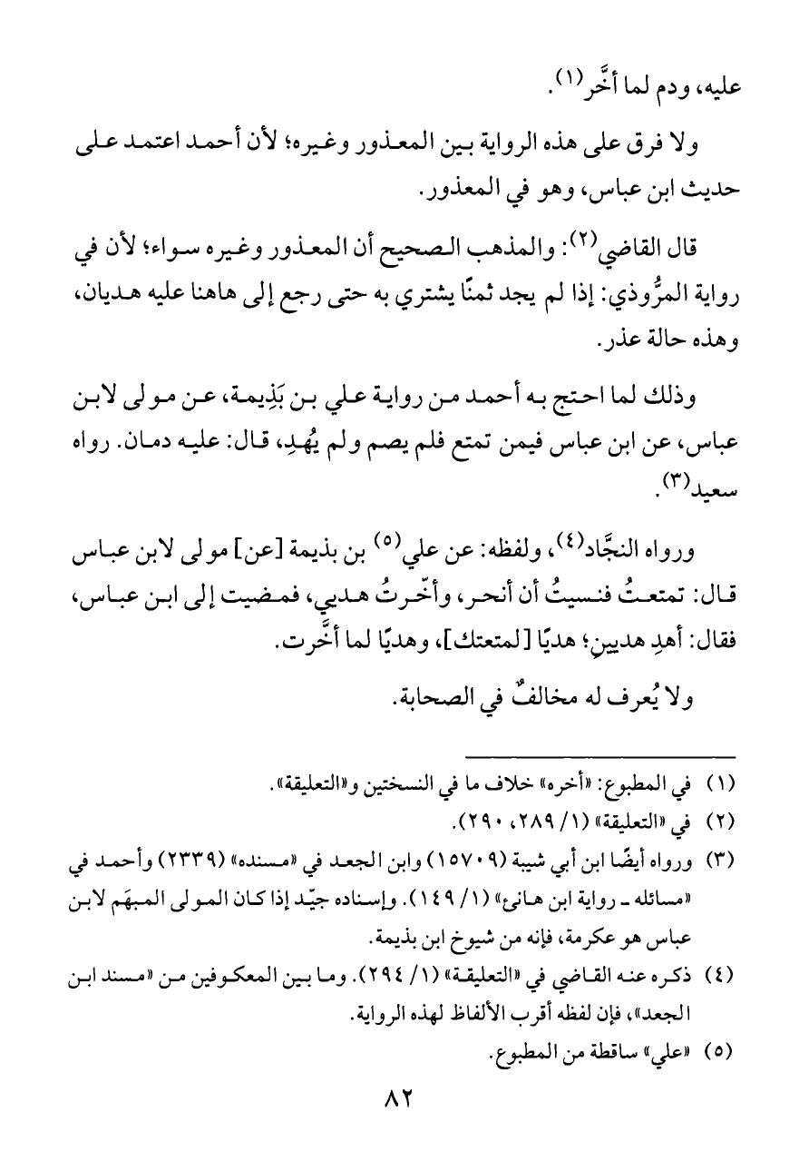 قال القاضي (¬٢): والمذهب الصحيح أن المعذور وغيره سواء؛ لأن في رواية المرُّوذي: إذا لم يجد ثمنًا يشتري به حتى رجع إلى هاهنا عليه هديان، وهذه حالة عذر.