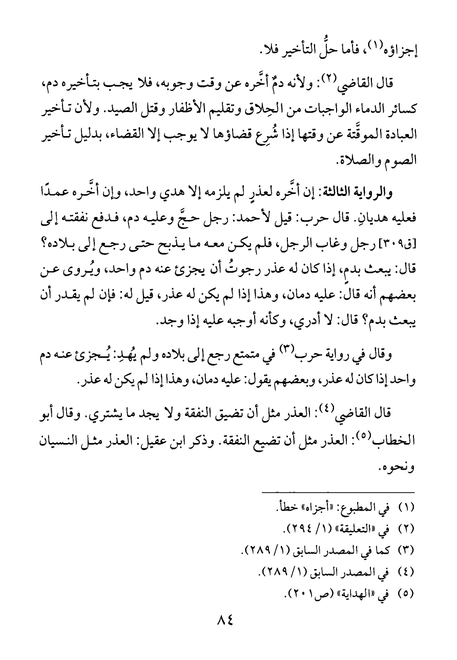 قال القاضي (¬٢): ولأنه دمٌ أخَّره عن وقت وجوبه، فلا يجب بتأخيره دم، كسائر الدماء الواجبات من الحِلاق وتقليم الأظفار وقتل الصيد. ولأن تأخير العبادة الموقَّتة عن وقتها إذا شُرِع قضاؤها لا يوجب إلا القضاء، بدليل تأخير الصوم والصلاة.