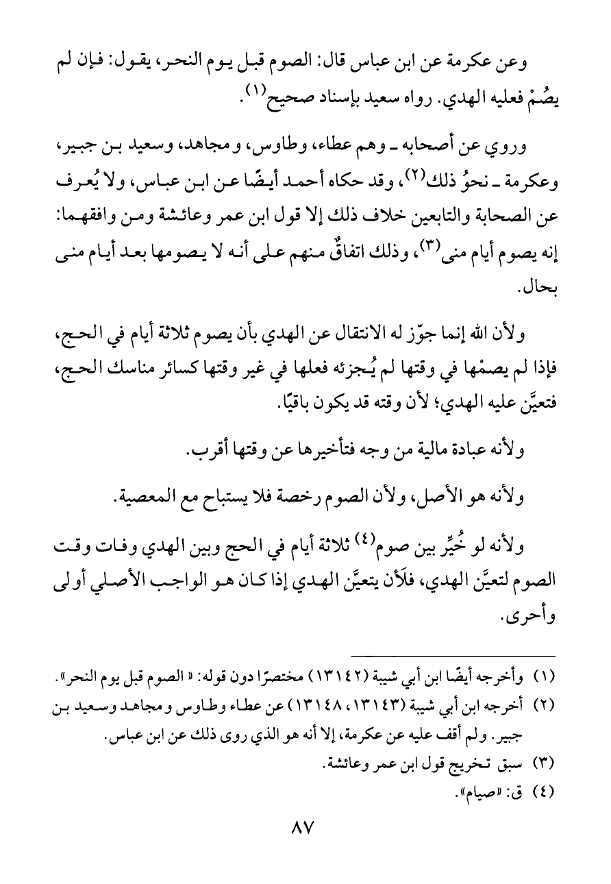 وعن عكرمة عن ابن عباس قال: الصوم قبل يوم النحر، يقول: فإن لم يصُمْ فعليه الهدي. رواه سعيد بإسناد صحيح (¬١).