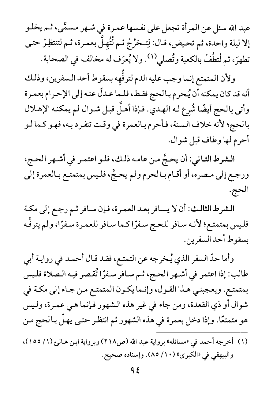 وأما حدّ السفر الذي يُخرجه عن التمتع، فقد قال أحمد في رواية أبي طالب: إذا اعتمر في أشهر الحج، ثم سافر سفرًا تُقصر فيه الصلاة فليس بمتمتع. ويعجبني هذا القول، وإنما يكون المتمتع من جاء إلى مكة في شوال أو ذي القعدة، ومن جاء في غير هذه الشهور فإنما هي عمرة، وليس هو متمتعًا. وإذا دخل بعمرة في هذه الشهور ثم انتظر حتى يهلّ بالحج من