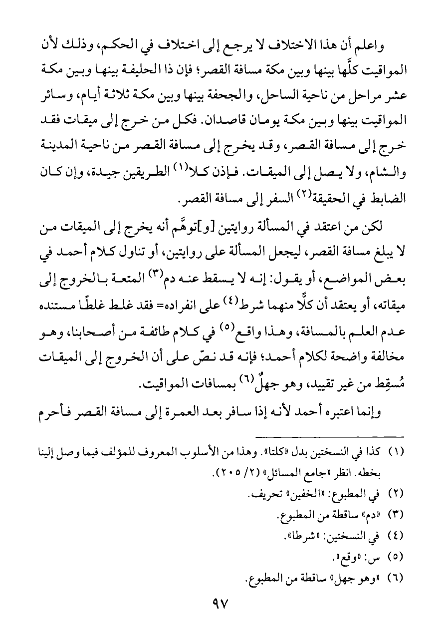 لكن من اعتقد في المسألة روايتين [و] توهَّم أنه يخرج إلى الميقات من لا يبلغ مسافة القصر، ليجعل المسألة على روايتين، أو تناول كلام أحمد في بعض المواضع، أو يقول: إنه لا يسقط عنه دم (¬٣) المتعة بالخروج إلى ميقاته، أو يعتقد أن كلًّا منهما شرط (¬٤) على انفراده= فقد غلط غلطًا مستنده عدم العلم بالمسافة، وهذا واقع (¬٥) في كلام طائفة من أصحابنا، وهو مخالفة واضحة لكلام أحمد؛ فإنه قد نصّ على أن الخروج إلى الميقات مُسقِط من غير تقييد، وهو جهلٌ (¬٦) بمسافات المواقيت.
