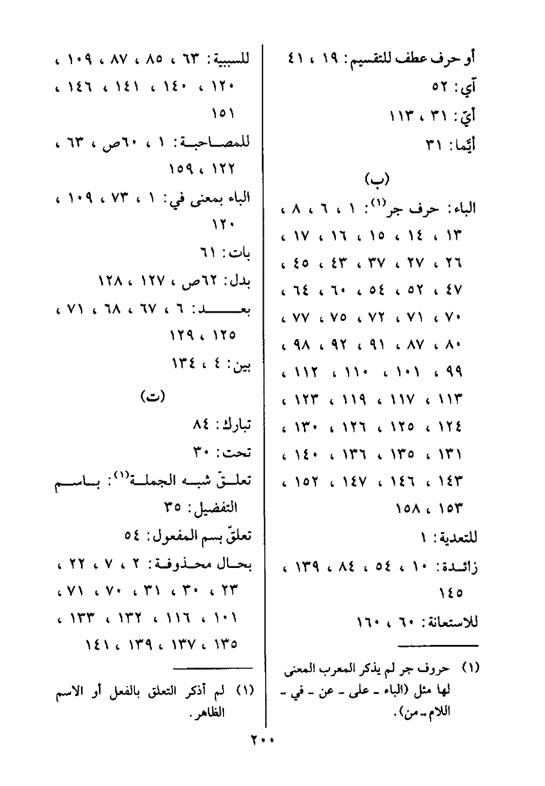 (ب) الباء: حرف جر «1» : 1، 6، 8، 13، 14، 15، 16، 17، 26، 27، 37، 43، 45، 47، 52، 54، 60، 64، 70، 71، 72، 75، 77، 80، 87، 91، 92، 98، 99، 101، 110، 112، 113، 117، 119، 123، 124، 125، 126، 130، 131، 135، 136، 140، 143، 146، 147، 152، 153، 158