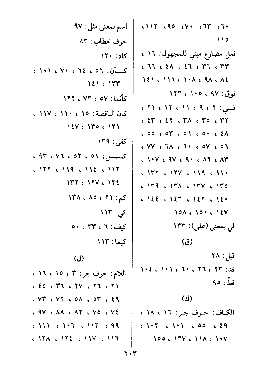 (ك) الكاف: حرف جر: 16، 18، 49، 55، 101، 102، 107، 118، 137، 155