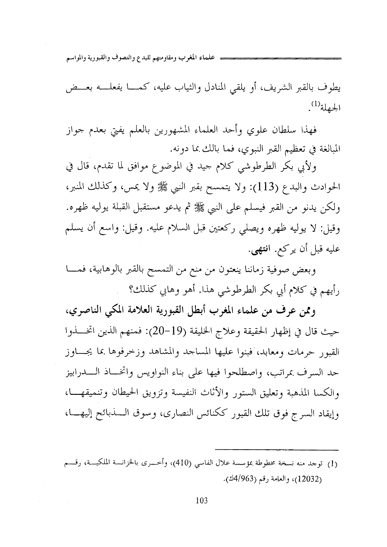 وممن عرف من علماء المغرب أبطل القبورية العلامة المكي الناصري، حيث قال في إظهار الحقيقة وعلاج الخليقة (19 - 20): فمنهم الذين اتخذوا القبور حرمات ومعابد، فبنوا عليها المساجد والمشاهد وزخرفوها بما يجاوز حد السرف بمراتب، واصطلحوا فيها على بناء النواويس واتخاذ الدرابيز والكسا المذهبة وتعليق الستور والأثاث النفيسة وتزويق الحيطان وتنميقها، وإيقاد السرج فوق تلك القبور ككنائس النصارى، وسوق الذبائح إليها،