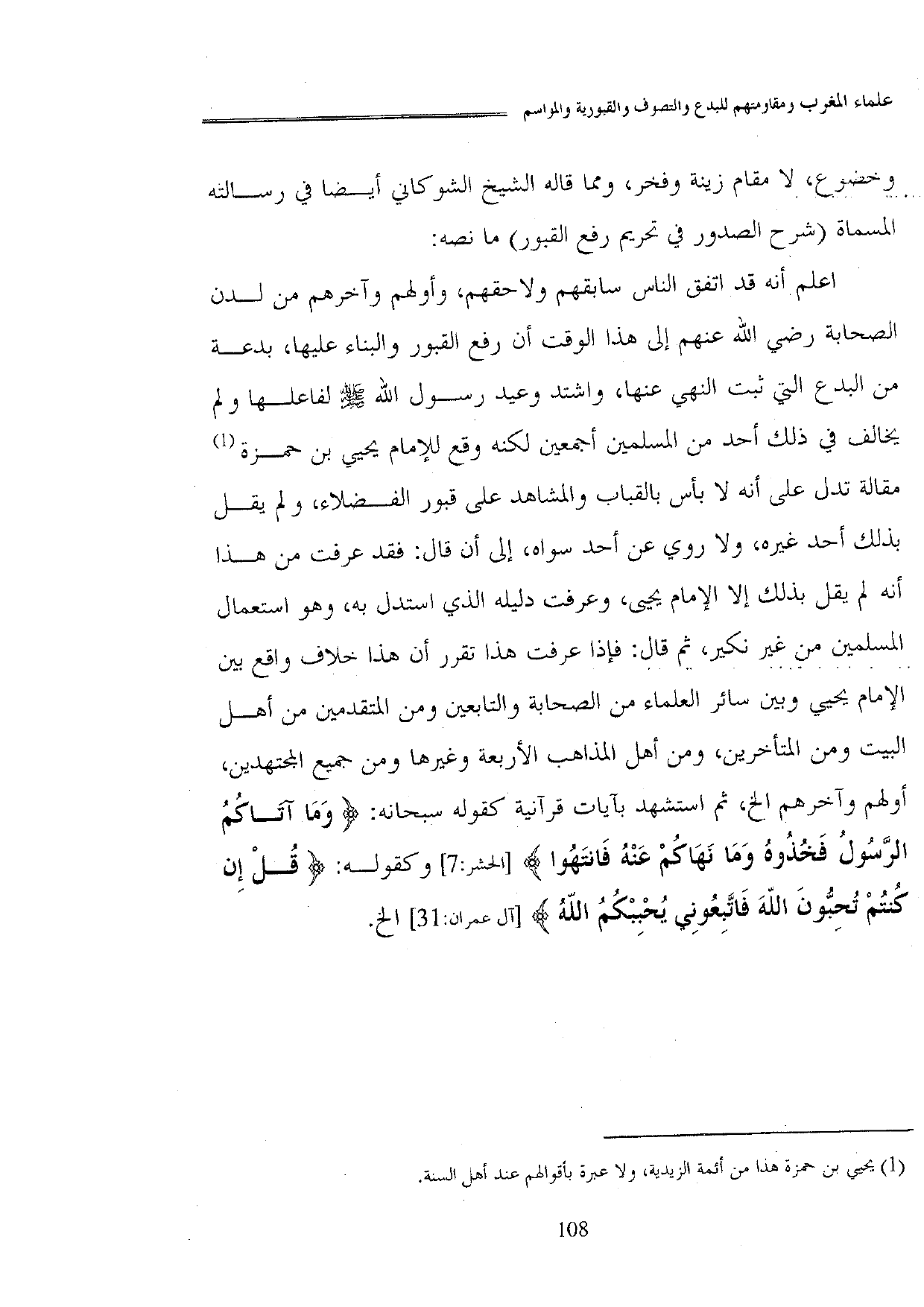 اعلم أنه قد اتفق الناس سابقهم ولاحقهم، وأولهم وآخرهم من لدن الصحابة رضي الله عنهم إلى هذا الوقت أن رفع القبور والبناء عليها، بدعة من البدع التي ثبت النهي عنها، واشتد وعيد رسول الله - صلى الله عليه وسلم - لفاعلها ولم يخالف في ذلك أحد من المسلمين أجمعين لكنه وقع للإمام يحيي بن حمزة (¬1) مقالة تدل على أنه لا بأس بالقباب والمشاهد على قبور الفضلاء، ولم يقل بذلك أحد غيره، ولا روي عن أحد سواه، إلى أن قال: فقد عرفت من هذا أنه لم يقل بذلك إلا الإمام يحيى، وعرفت دليله الذي استدل به، وهو استعمال المسلمين من غير نكير، ثم قال: فإذا عرفت هذا تقرر أن هذا خلاف واقع بين الإمام يحيي وبين سائر العلماء من الصحابة والتابعين ومن المتقدمين من أهل البيت ومن المتأخرين، ومن أهل المذاهب الأربعة وغيرها ومن جميع المجتهدين، أولهم وآخرهم الخ، ثم استشهد بآيات قرآنية كقوله سبحانه: {وَمَا آتَاكُمُ الرَّسُولُ فَخُذُوهُ وَمَا نَهَاكُمْ عَنْهُ فَانتَهُوا} [الحشر:7] وكقوله: {قُلْ إِن كُنتُمْ تُحِبُّونَ اللهَ فَاتَّبِعُونِي يُحْبِبْكُمُ اللهُ} [آل عمران:31] الخ.