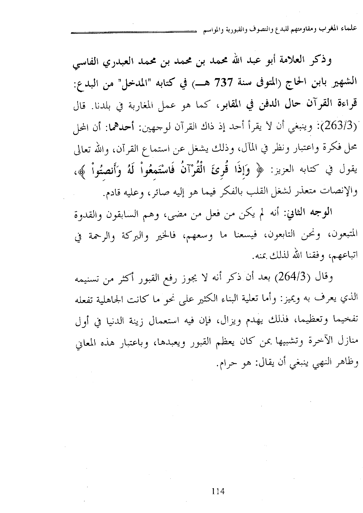 وذكر العلامة أبو عبد الله محمد بن محمد بن محمد العبدري الفاسي الشهير بابن الحاج (المتوفى سنة 737 هـ) في كتابه "المدخل" من البدع: قراءة القرآن حال الدفن في المقابر، كما هو عمل المغاربة في بلدنا. قال (3/ 263): وينبغي أن لا يقرأ أحد إذ ذاك القرآن لوجهين: أحدهما: أن المحل محل فكرة واعتبار ونظر في المآل، وذلك يشغل عن استماع القرآن، والله تعالى يقول في كتابه العزيز: {وَإِذَا قُرِئَ الْقُرْآنُ فَاسْتَمِعُوا لَهُ وَأَنصِتُوا}، والإنصات متعذر لشغل القلب بالفكر فيما هو إليه صائر، وعليه قادم.