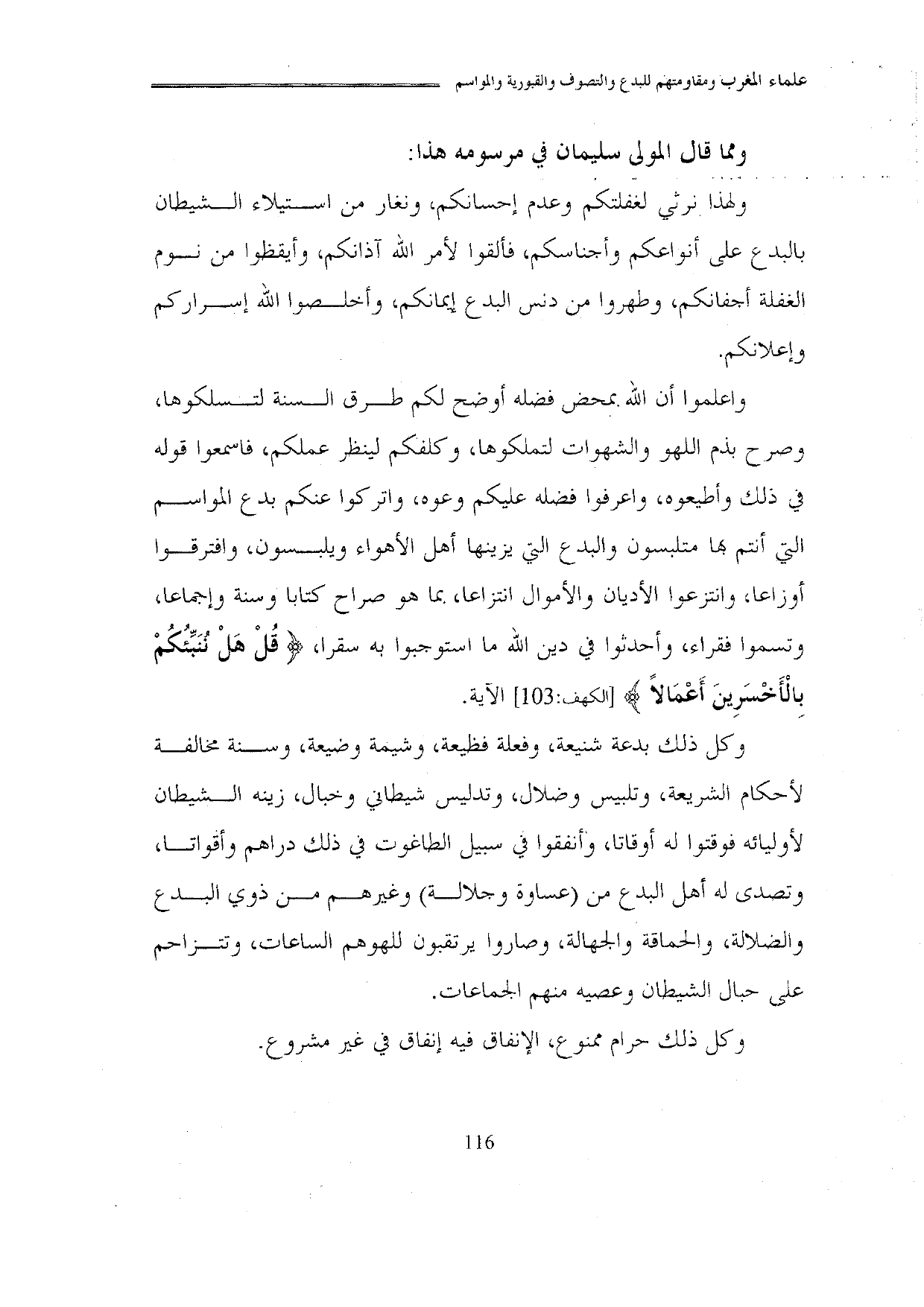ولهذا نرثي لغفلتكم وعدم إحسانكم, ونغار من استيلاء الشيطان بالبدع على أنواعكم وأجناسكم, فألقوا لأمر الله آذانكم, وأيقظوا من نوم الغفلة أجفانكم, وطهروا من دنس البدع إيمانكم, وأخلصوا الله إسراركم وإعلانكم.
