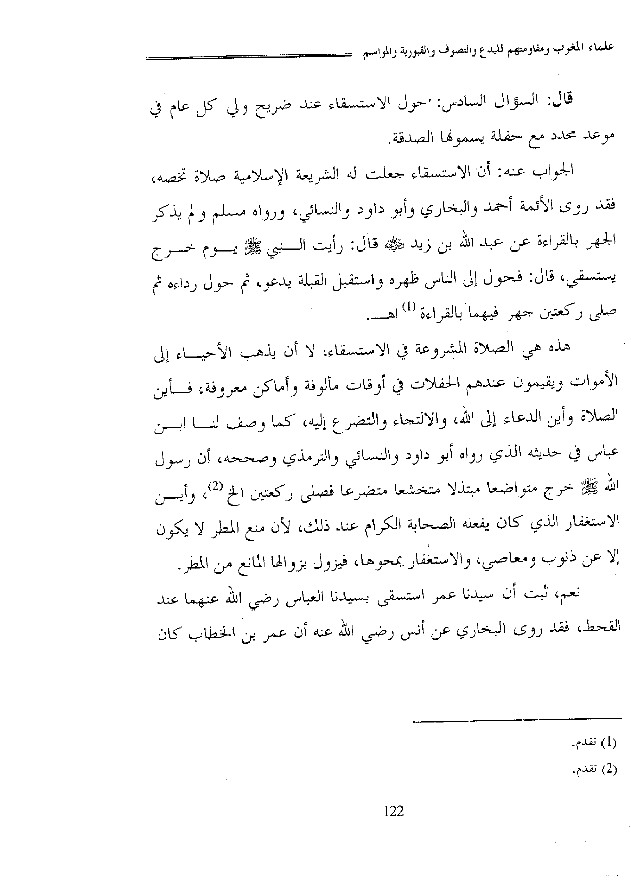 هذه هي الصلاة المشروعة في الاستسقاء، لا أن يذهب الأحياء إلى الأموات ويقيمون عندهم الحفلات في أوقات مألوفة وأماكن معروفة، فأين الصلاة وأين الدعاء إلى الله، والالتجاء والتضرع إليه، كما وصف لنا ابن عباس في حديثه الذي رواه أبو داود والنسائي والترمذي وصححه، أن رسول الله - صلى الله عليه وسلم - خرج متواضعا مبتذلا متخشعا متضرعا فصلى ركعتين الخ (¬2)، وأين الاستغفار الذي كان يفعله الصحابة الكرام عند ذلك، لأن منع المطر لا يكون إلا عن ذنوب ومعاصي، والاستغفار يمحوها، فيزول بزوالها المانع من المطر.