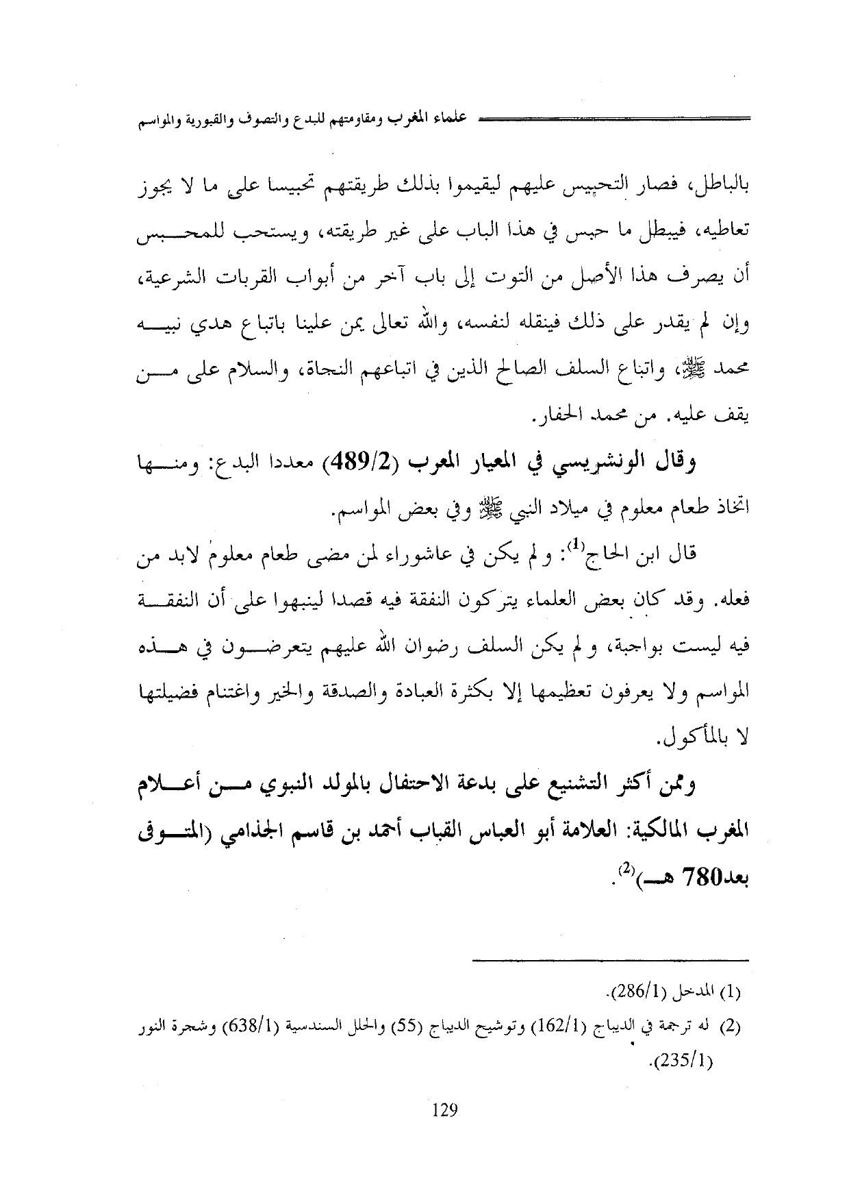 وممن أكثر التشنيع على بدعة الاحتفال بالمولد النبوي من أعلام المغرب المالكية: العلامة أبو العباس القباب أحمد بن قاسم الجذامي (المتوفى بعد780 هـ) (¬2).