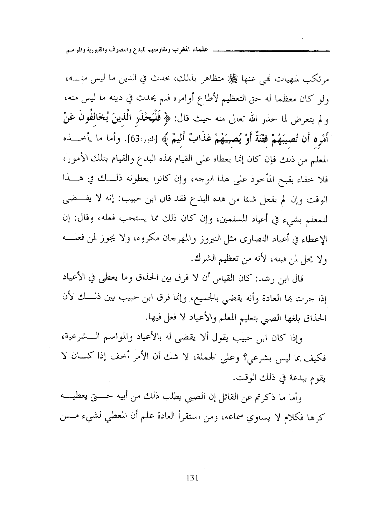 مرتكب لمنهيات نهى عنها - صلى الله عليه وسلم - متظاهر بذلك، محدث في الدين ما ليس منه، ولو كان معظما له حق التعظيم لأطاع أوامره فلم يحدث في دينه ما ليس منه، ولم يتعرض لما حذر الله تعالى منه حيث قال: {فَلْيَحْذَرِ الَّذِينَ يُخَالِفُونَ عَنْ أَمْرِهِ أَن تُصِيبَهُمْ فِتْنَةٌ أَوْ يُصِيبَهُمْ عَذَابٌ أَلِيمٌ} [النور:63]. وأما ما يأخذه المعلم من ذلك فإن كان إنما يعطاه على القيام بهذه البدع والقيام بتلك الأمور، فلا خفاء بقبح المأخوذ على هذا الوجه، وإن كانوا يعطونه ذلك في هذا الوقت وإن لم يفعل شيئا من هذه البدع فقد قال ابن حبيب: إنه لا يقضى للمعلم بشيء في أعياد المسلمين، وإن كان ذلك مما يستحب فعله، وقال: إن الإعطاء في أعياد النصارى مثل النيروز والمهرجان مكروه، ولا يجوز لمن فعله ولا يحل لمن قبله، لأنه من تعظيم الشرك.