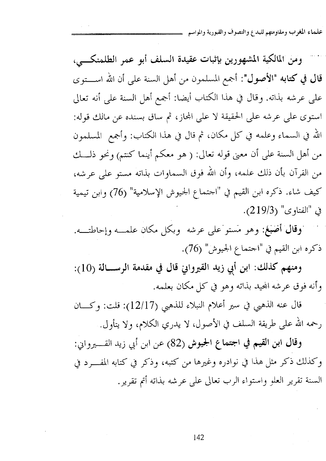 ومنهم كذلك: ابن أبي زيد القيرواني قال في مقدمة الرسالة (10): وأنه فوق عرشه المجيد بذاته وهو في كل مكان بعلمه.