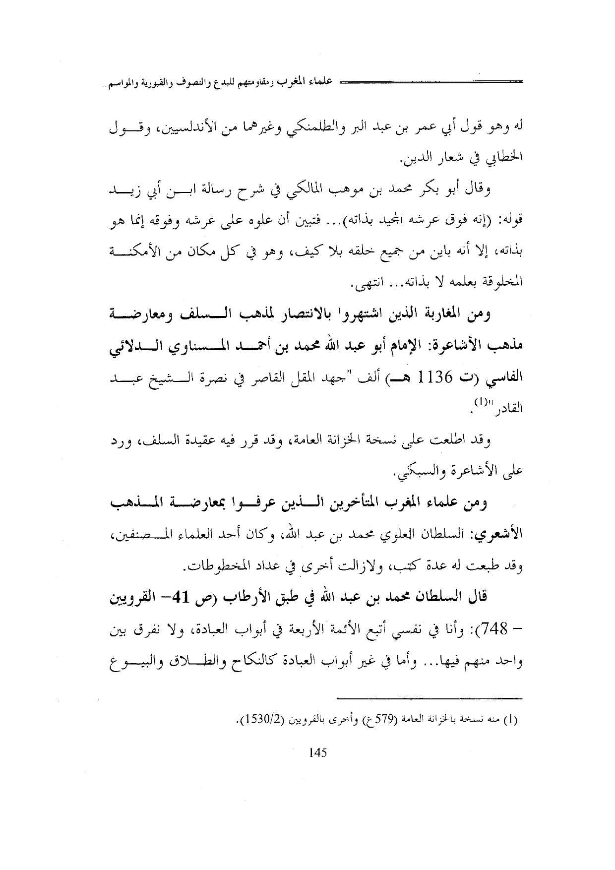 ومن المغاربة الذين اشتهروا بالانتصار لمذهب السلف ومعارضة مذهب الأشاعرة: الإمام أبو عبد الله محمد بن أحمد المسناوي الدلائي الفاسي (ت 1136 هـ) ألف "جهد المقل القاصر في نصرة الشيخ عبد القادر" (¬1).
