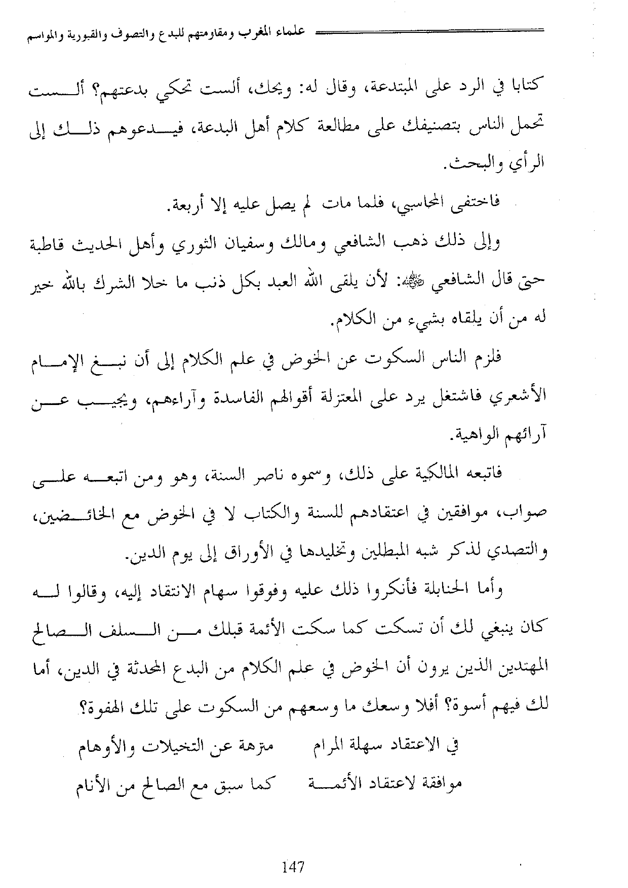 فاتبعه المالكية على ذلك، وسموه ناصر السنة، وهو ومن اتبعه على صواب، موافقين في اعتقادهم للسنة والكتاب لا في الخوض مع الخائضين، والتصدي لذكر شبه المبطلين وتخليدها في الأوراق إلى يوم الدين.