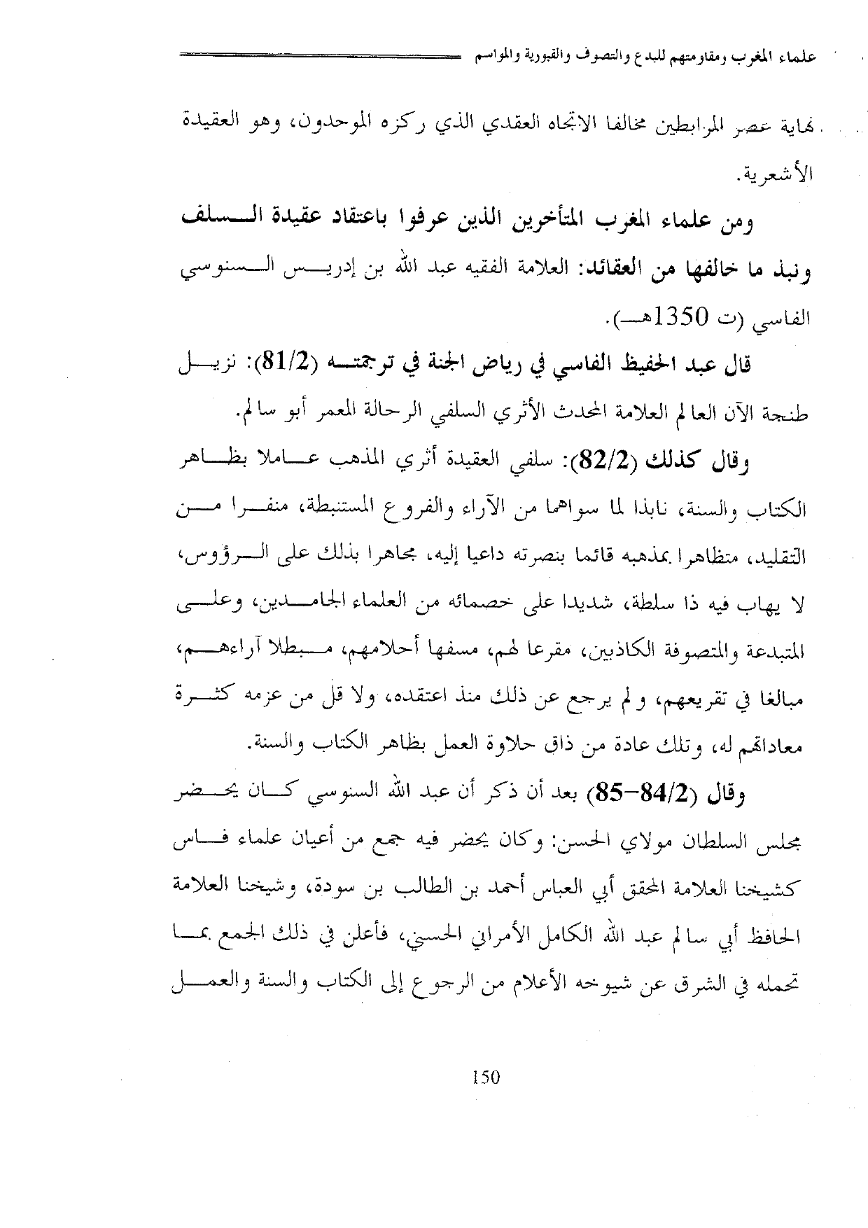 ومن علماء المغرب المتأخرين الذين عرفوا باعتقاد عقيدة السلف ونبذ ما خالفها من العقائد: العلامة الفقيه عبد الله بن إدريس السنوسي الفاسي (ت 1350هـ).