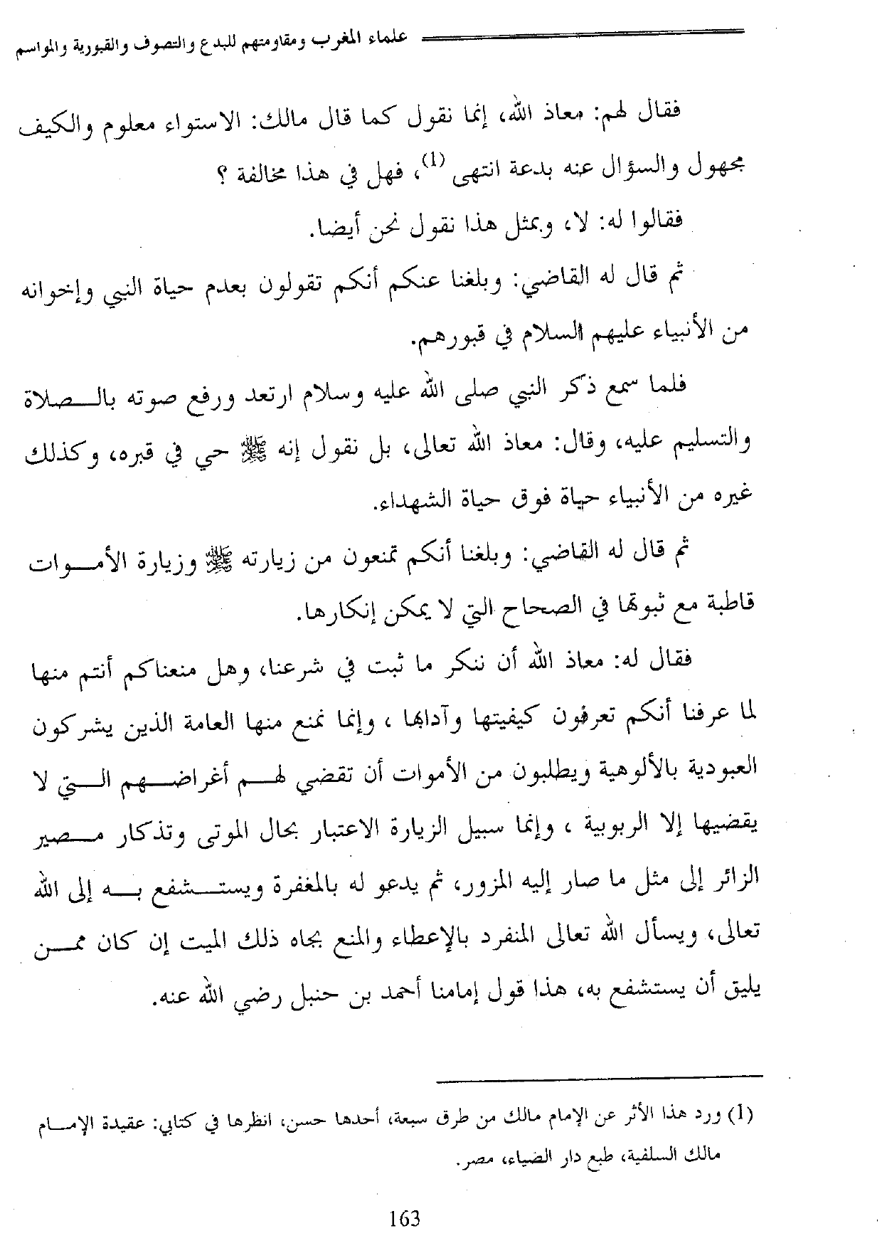 فقال له: معاذ الله أن ننكر ما ثبت في شرعنا, وهل منعناكم أنتم منها لما عرفنا أنكم تعرفون كيفيتها وآدابها , وإنما نمنع منها العامة الذين يشركون العبودية بالألوهية ويطلبون من الأموات أن تقضي لهم أغراضهم التي لا يقضيها إلا الربوبية , وإنما سبيل الزيارة الاعتبار بحال الموتى وتذكار مصير الزائر إلى مثل ما صار إليه المزور, ثم يدعو له بالمغفرة ويستشفع به إلى الله تعالى, ويسأل الله تعالى المنفرد بالإعطاء والمنع بجاه ذلك الميت إن كان ممن يليق أن يستشفع به, هذا قول إمامنا أحمد بن حنبل رضي الله عنه.
