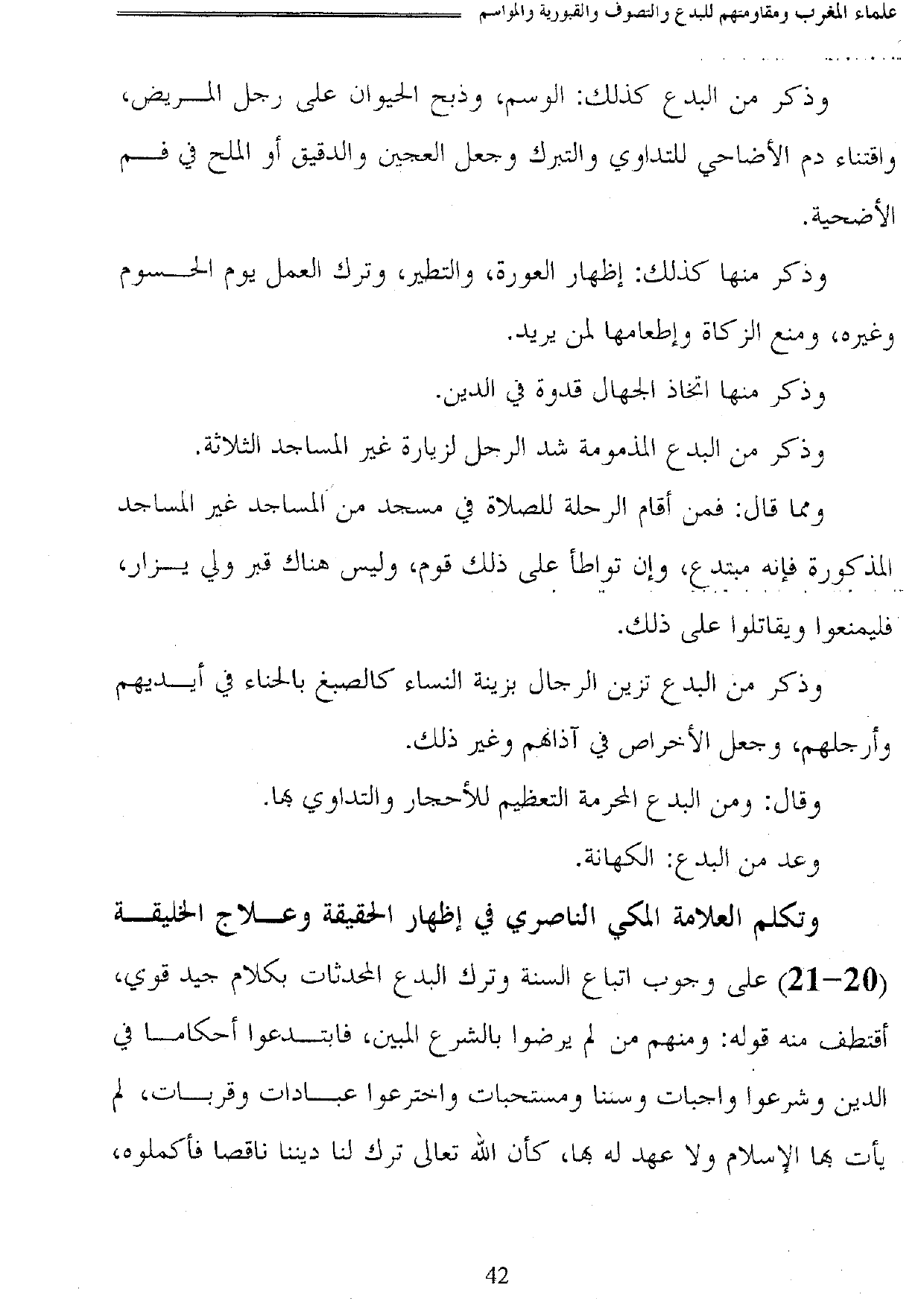 وتكلم العلامة المكي الناصري في إظهار الحقيقة وعلاج الخليقة (20 - 21) على وجوب اتباع السنة وترك البدع المحدثات بكلام جيد قوي، أقتطف منه قوله: ومنهم من لم يرضوا بالشرع المبين، فابتدعوا أحكاما في الدين وشرعوا واجبات وسننا ومستحبات واخترعوا عبادات وقربات، لم يأت بها الإسلام ولا عهد له بها، كأن الله تعالى ترك لنا ديننا ناقصا فأكملوه,