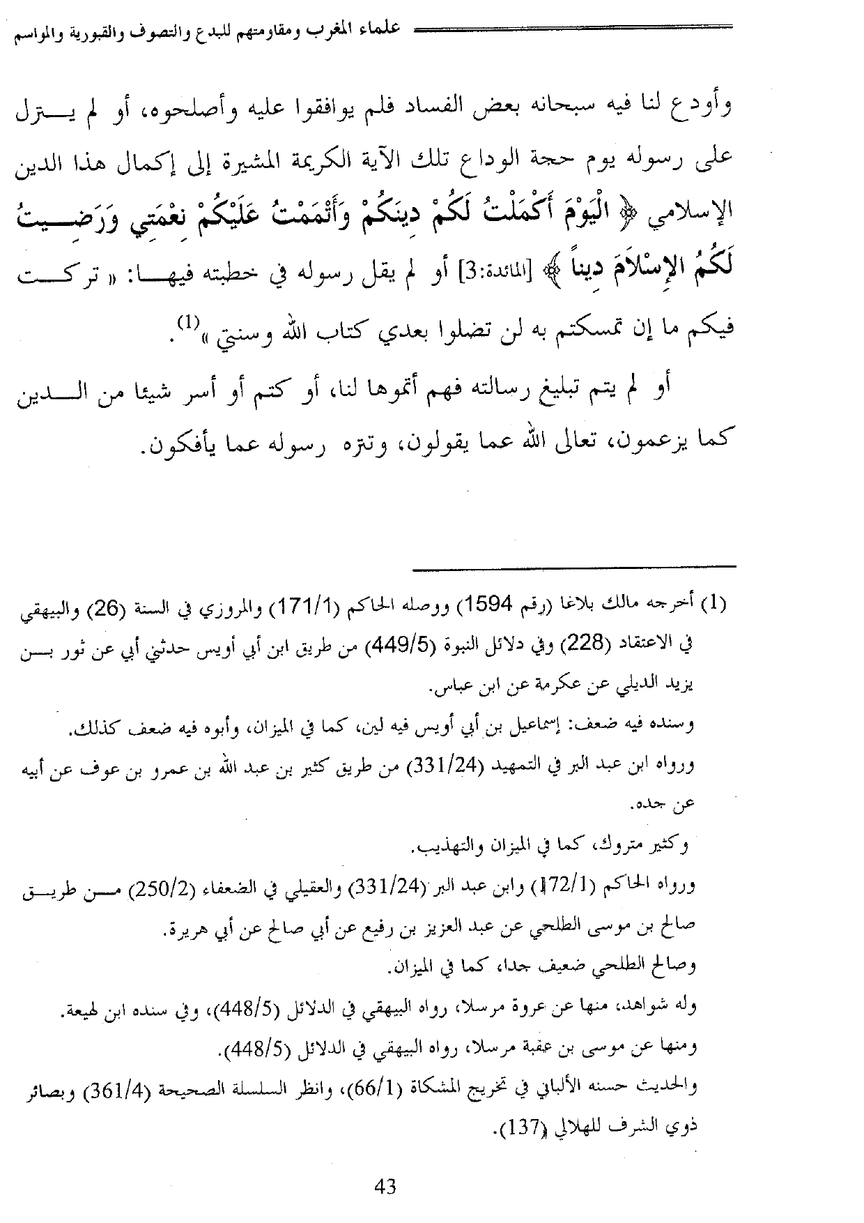 وأودع لنا فيه سبحانه بعض الفساد فلم يوافقوا عليه وأصلحوه، أو لم ينزل على رسوله يوم حجة الوداع تلك الآية الكريمة المشيرة إلى إكمال هذا الدين الإسلامي {الْيَوْمَ أَكْمَلْتُ لَكُمْ دِينَكُمْ وَأَتْمَمْتُ عَلَيْكُمْ نِعْمَتِي وَرَضِيتُ لَكُمُ الإِسْلاَمَ دِيناً} [المائدة:3] أو لم يقل رسوله في خطبته فيها: «تركت فيكم ما إن تمسكتم به لن تضلوا بعدي كتاب الله وسنتي» (¬1).