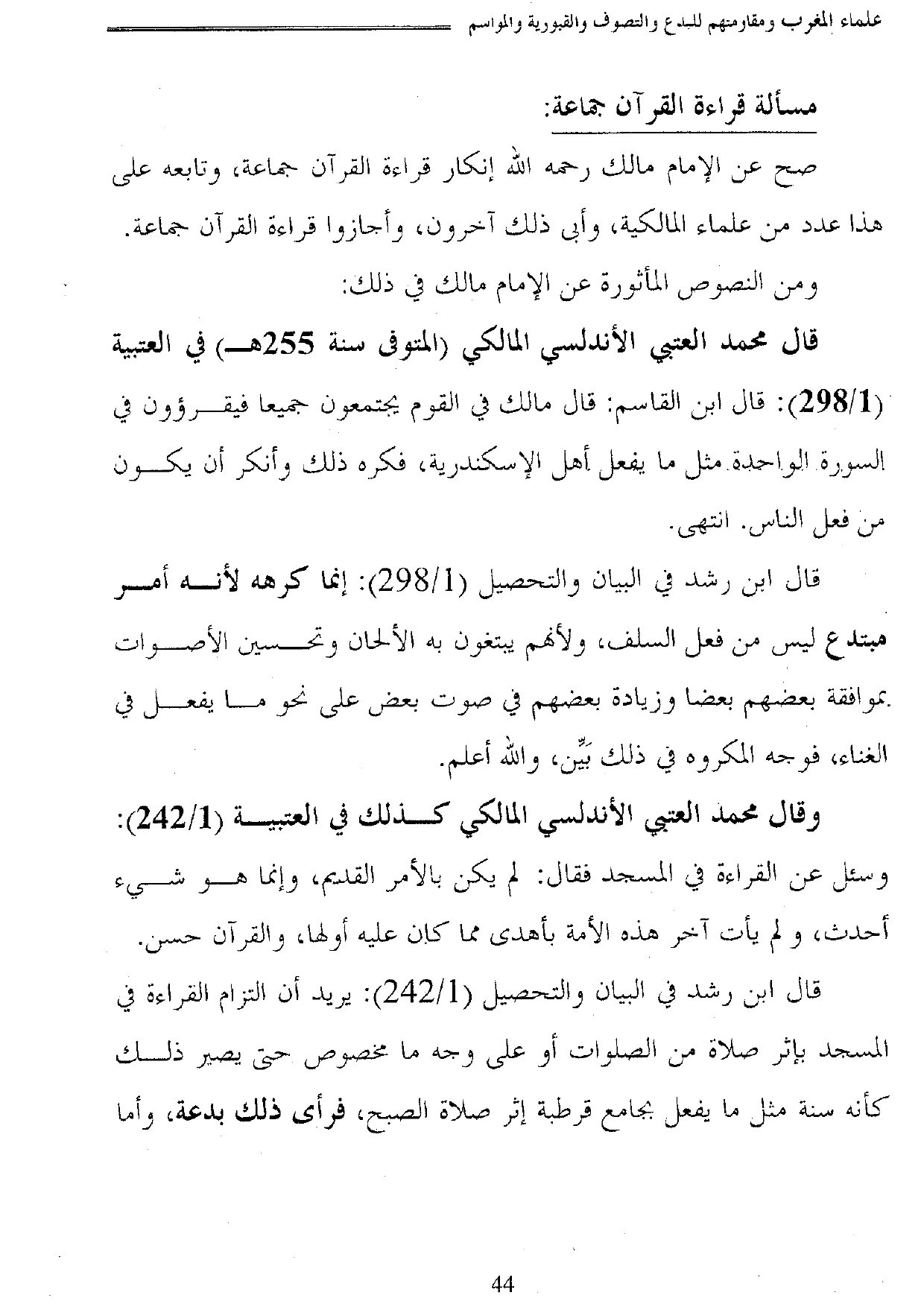 وقال محمد العتبي الأندلسي المالكي كذلك في العتبية (1/ 242): وسئل عن القراءة في المسجد فقال: لم يكن بالأمر القديم، وإنما هو شيء أحدث، ولم يأت آخر هذه الأمة بأهدى مما كان عليه أولها، والقرآن حسن.