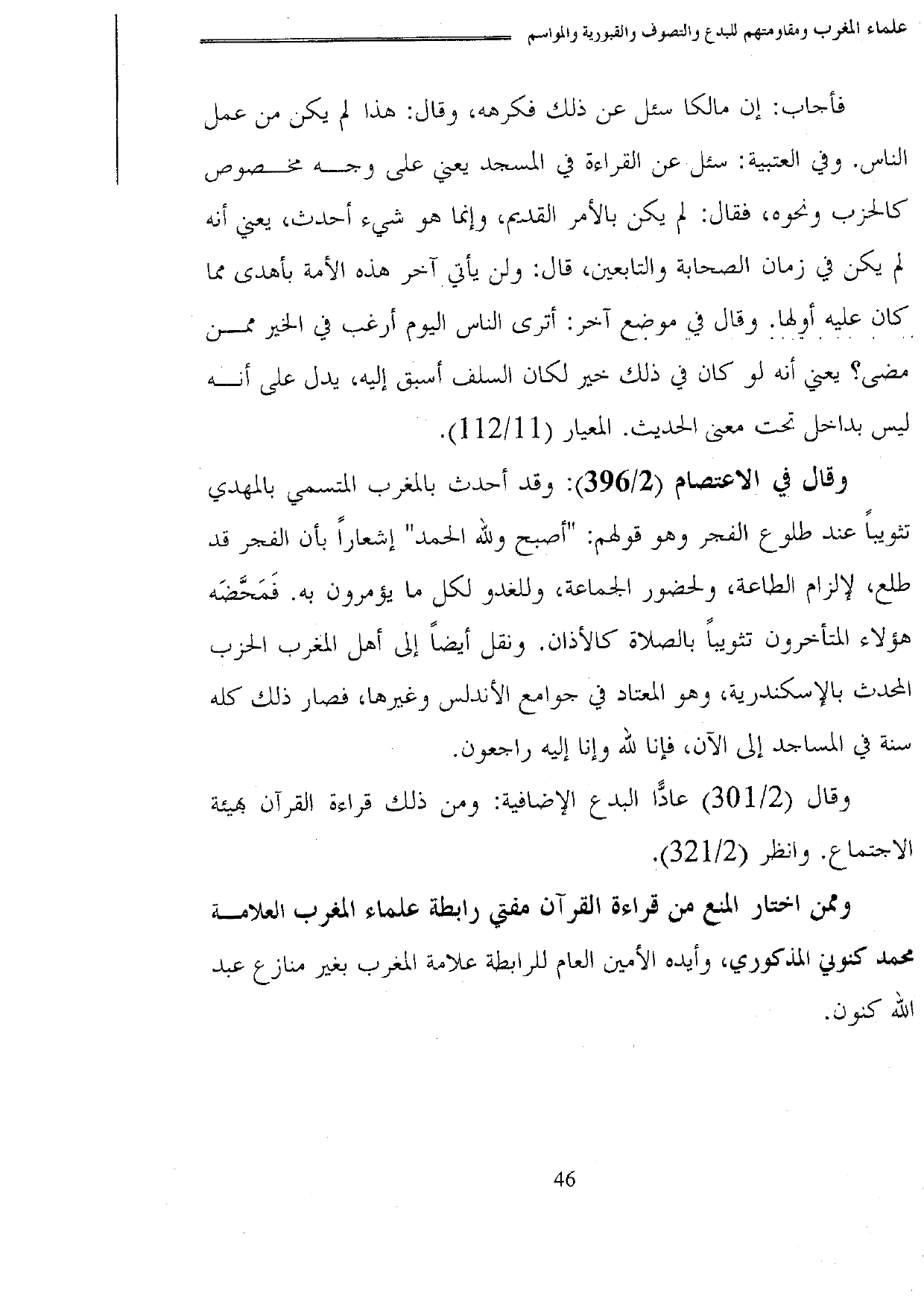 فأجاب: إن مالكا سئل عن ذلك فكرهه، وقال: هذا لم يكن من عمل الناس. وفي العتبية: سئل عن القراءة في المسجد يعني على وجه مخصوص كالحزب ونحوه، فقال: لم يكن بالأمر القديم، وإنما هو شيء أحدث، يعني أنه لم يكن في زمان الصحابة والتابعين، قال: ولن يأتي آخر هذه الأمة بأهدى مما كان عليه أولها. وقال في موضع آخر: أترى الناس اليوم أرغب في الخير ممن مضى؟ يعني أنه لو كان في ذلك خير لكان السلف أسبق إليه، يدل على أنه ليس بداخل تحت معنى الحديث. المعيار (11/ 112).