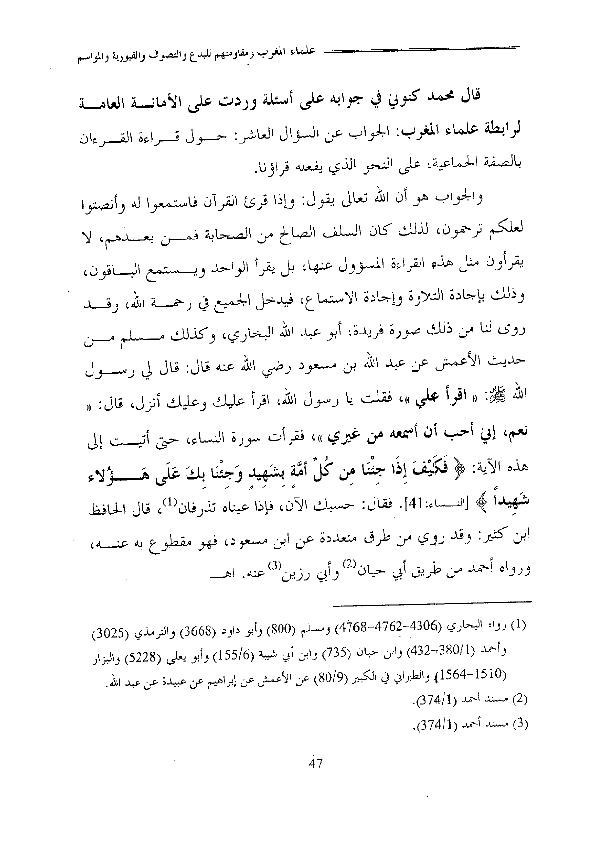 قال محمد كنوني في جوابه على أسئلة وردت على الأمانة العامة لرابطة علماء المغرب: الجواب عن السؤال العاشر: حول قراءة القرءان بالصفة الجماعية، على النحو الذي يفعله قراؤنا.