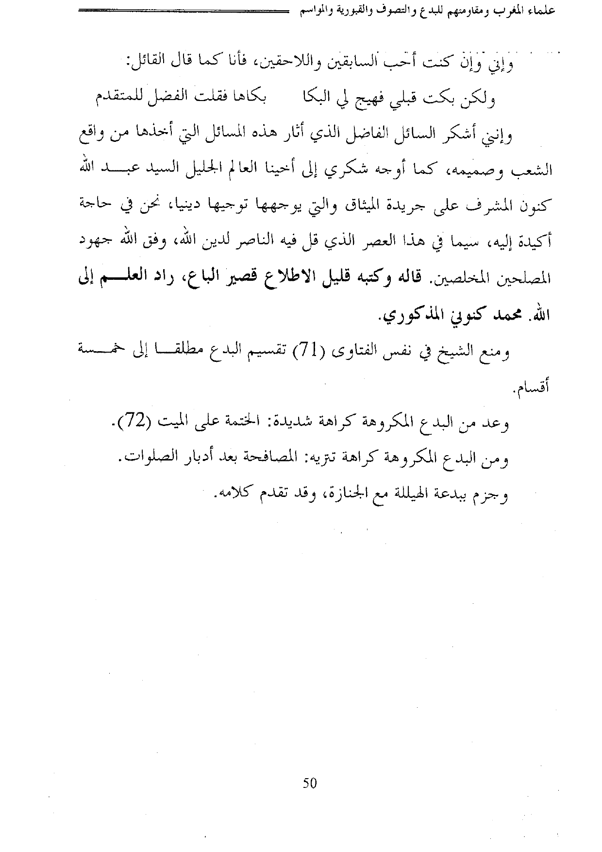 وإنني أشكر السائل الفاضل الذي أثار هذه المسائل التي أخذها من واقع الشعب وصميمه، كما أوجه شكري إلى أخينا العالم الجليل السيد عبد الله كنون المشرف على جريدة الميثاق والتي يوجهها توجيها دينيا، نحن في حاجة أكيدة إليه، سيما في هذا العصر الذي قل فيه الناصر لدين الله، وفق الله جهود المصلحين المخلصين. قاله وكتبه قليل الاطلاع قصير الباع، راد العلم إلى الله. محمد كنوني المذكوري.