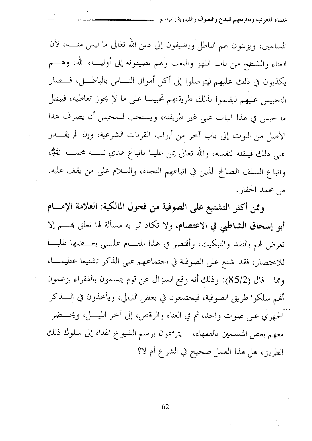 وممن أكثر التشنيع على الصوفية من فحول المالكية: العلامة الإمام أبو إسحاق الشاطبي في الاعتصام، ولا تكاد تمر به مسألة لها تعلق بهم إلا تعرض لهم بالنقد والتبكيت، وأقتصر في هذا المقام على بعضها طلبا للاختصار، فقد شنع على الصوفية في اجتماعهم على الذكر تشنيعا عظيما، ومما قال (2/ 85): وذلك أنه وقع السؤال عن قوم يتسمون بالفقراء يزعمون أنهم سلكوا طريق الصوفية، فيجتمعون في بعض الليالي، ويأخذون في الذكر الجهري على صوت واحد، ثم في الغناء والرقص، إلى آخر الليل، ويحضر معهم بعض المتسمين بالفقهاء، يترسمون برسم الشيوخ الهداة إلى سلوك ذلك الطريق، هل هذا العمل صحيح في الشرع أم لا؟