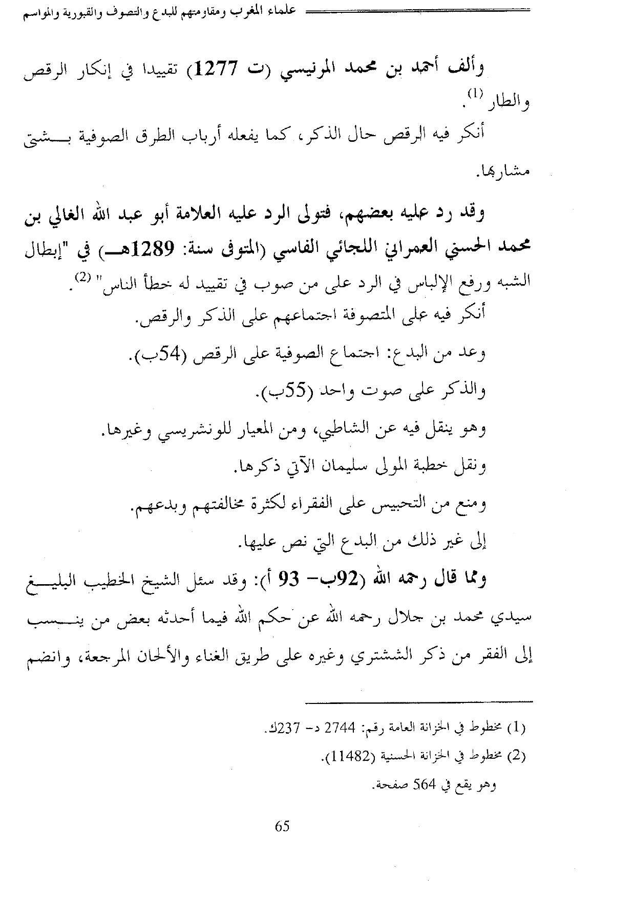 وألف أحمد بن محمد المرنيسي (ت 1277) تقييدا في إنكار الرقص والطار (¬1).