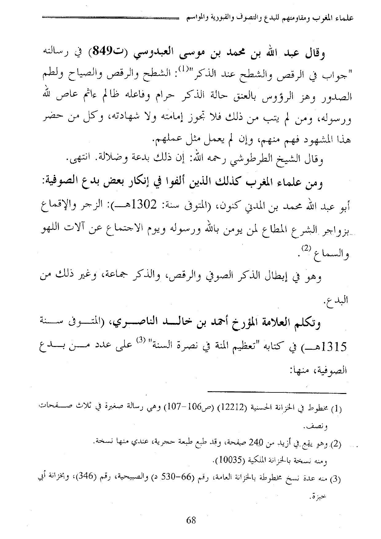 وتكلم العلامة المؤرخ أحمد بن خالد الناصري، (المتوفى سنة 1315هـ) في كتابه "تعظيم المنة في نصرة السنة" (¬3) على عدد من بدع الصوفية، منها: