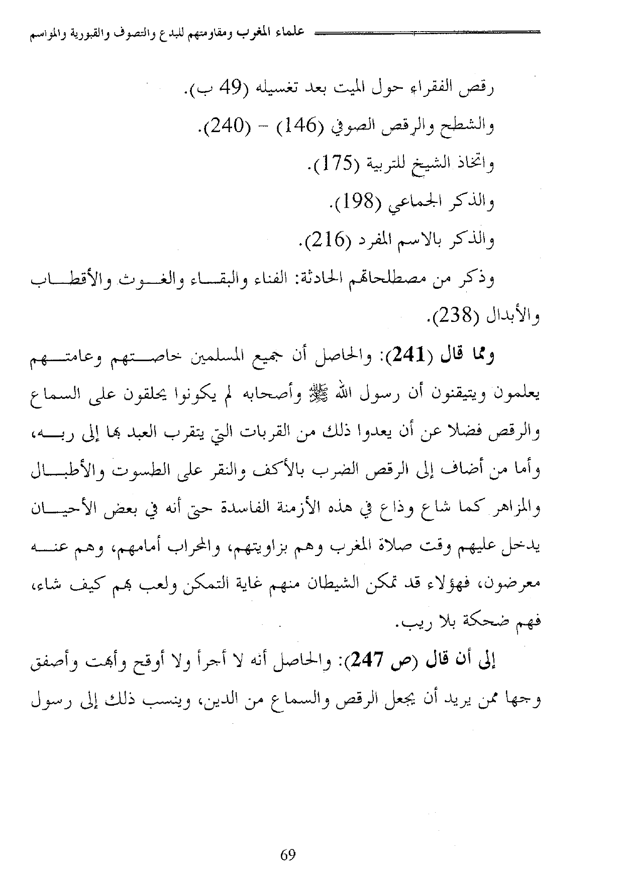 إلى أن قال (ص 247): والحاصل أنه لا أجرأ ولا أوقح وأبهت وأصفق وجها ممن يريد أن يجعل الرقص والسماع من الدين، وينسب ذلك إلى رسول