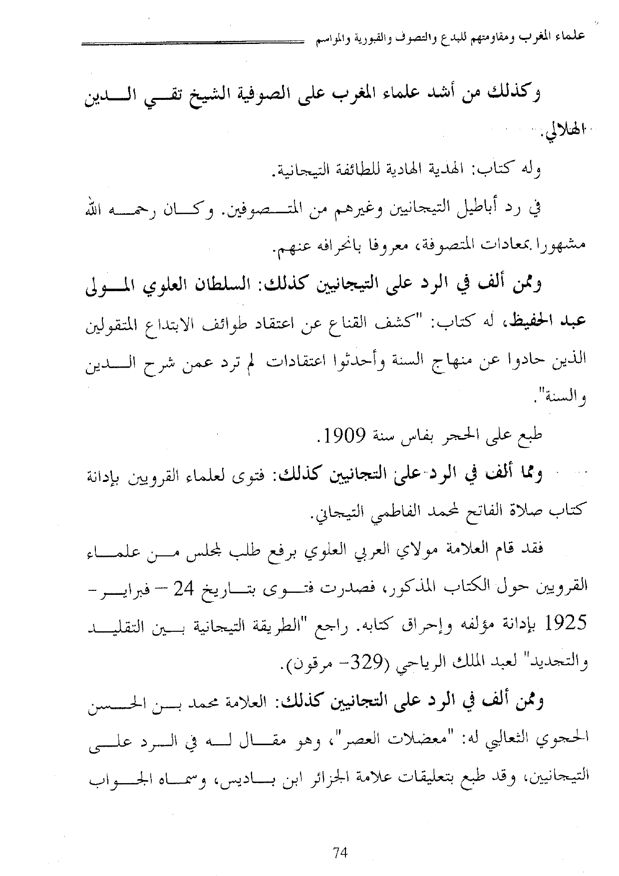 وكذلك من أشد علماء المغرب على الصوفية الشيخ تقي الدين الهلالي.