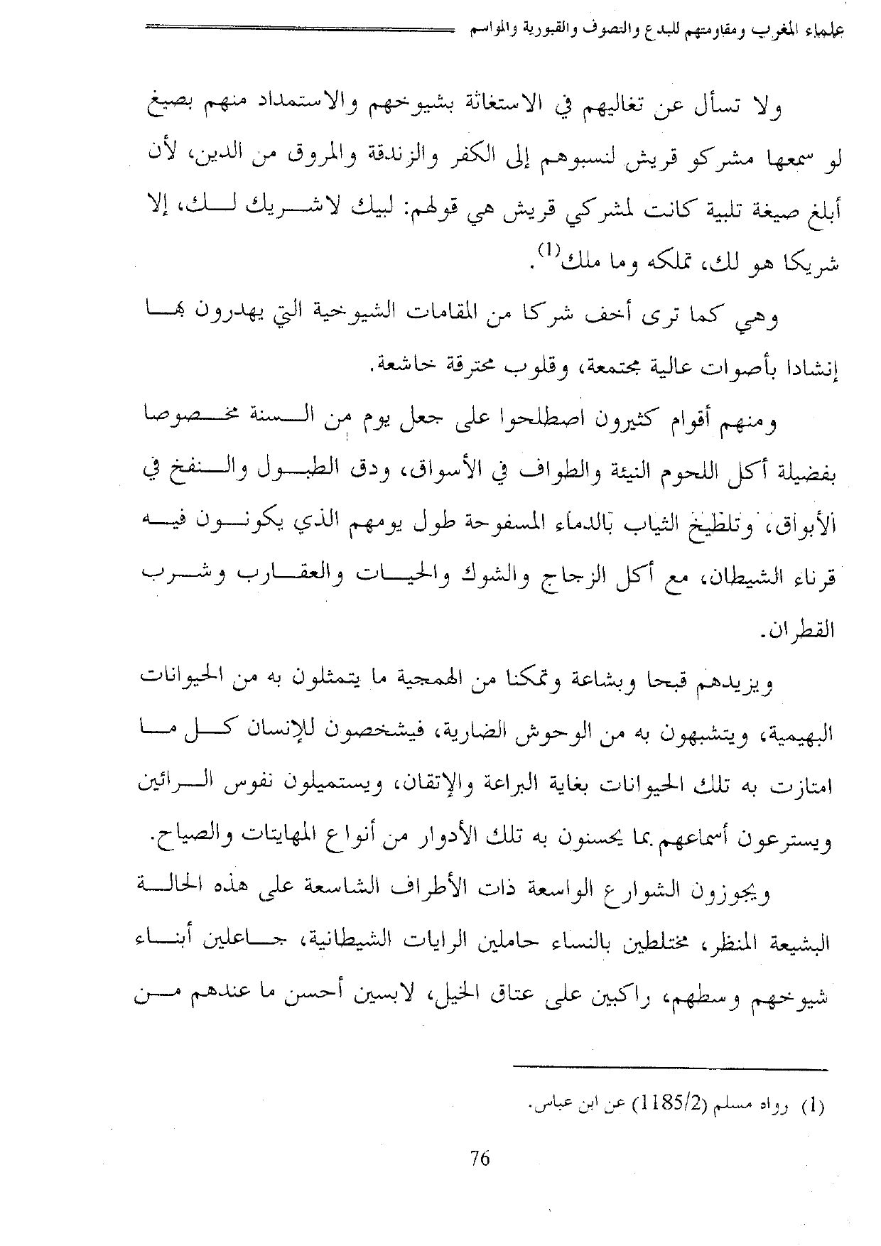 ولا تسأل عن تغاليهم في الاستغاثة بشيوخهم والاستمداد منهم بصيغ لو سمعها مشركو قريش لنسبوهم إلى الكفر والزندقة والمروق من الدين، لأن أبلغ صيغة تلبية كانت لمشركي قريش هي قولهم: لبيك لاشريك لك، إلا شريكا هو لك، تملكه وما ملك (¬1).