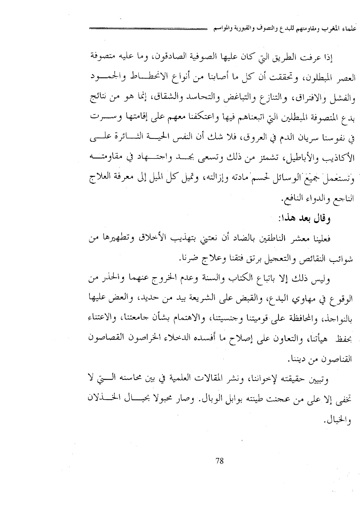 إذا عرفت الطريق التي كان عليها الصوفية الصادقون، وما عليه متصوفة العصر المبطلون، وتحققت أن كل ما أصابنا من أنواع الانحطاط والجمود والفشل والافتراق، والتنازع والتباغض والتحاسد والشقاق، إنما هو من نتائج بدع المتصوفة المبطلين التي اتبعناهم فيها واعتكفنا معهم على إقامتها وسرت في نفوسنا سريان الدم في العروق، فلا شك أن النفس الحية الثائرة على الأكاذيب والأباطيل، تشمئز من ذلك وتسعى بجد واجتهاد في مقاومته وتستعمل جميع الوسائل لحسم مادته وإزالته، وتميل كل الميل إلى معرفة العلاج الناجع والدواء النافع.