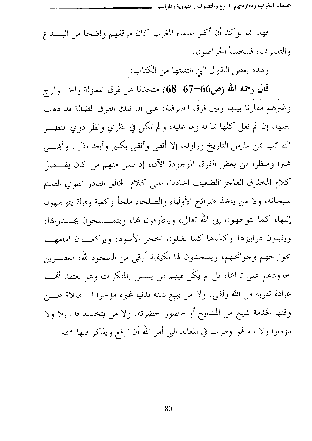 قال رحمه الله (ص66 - 67 - 68) متحدثا عن فرق المعتزلة والخوارج وغيرهم مقارنا بينها وبين فرق الصوفية: على أن تلك الفرق الضالة قد ذهب جلها، إن لم نقل كلها بما له وما عليه، ولم تكن في نظري ونظر ذوي النظر الصائب ممن مارس التاريخ وزاوله، إلا أتقى وأنقى بكثير وأبعد نظرا، وأبهى مخبرا ومنظرا من بعض الفرق الموجودة الآن، إذ ليس منهم من كان يفضل كلام المخلوق العاجز الضعيف الحادث على كلام الخالق القادر القوي القديم سبحانه، ولا من يتخذ ضرائح الأولياء والصلحاء ملجأ وكعبة وقبلة يتوجهون إليها، كما يتوجهون إلى الله تعالى، ويتطوفون بها، ويتمسحون بجدرانها، ويقبلون درابيزها وكساها كما يقبلون الحجر الأسود، ويركعون أمامها بجوارحهم وجوانحهم، ويسجدون لها بكيفية أرقى من السجود لله، معفرين خدودهم على ترابها، بل لم يكن فيهم من يتلبس بالمنكرات وهو يعتقد أنها عبادة تقربه من الله زلفى، ولا من يبيع دينه بدنيا غيره مؤخرا الصلاة عن وقتها لخدمة شيخ من المشايخ أو حضور حضرته، ولا من يتخذ طبلا ولا مزمارا ولا آلة لهو وطرب في المعابد التي أمر الله أن ترفع ويذكر فيها اسمه.