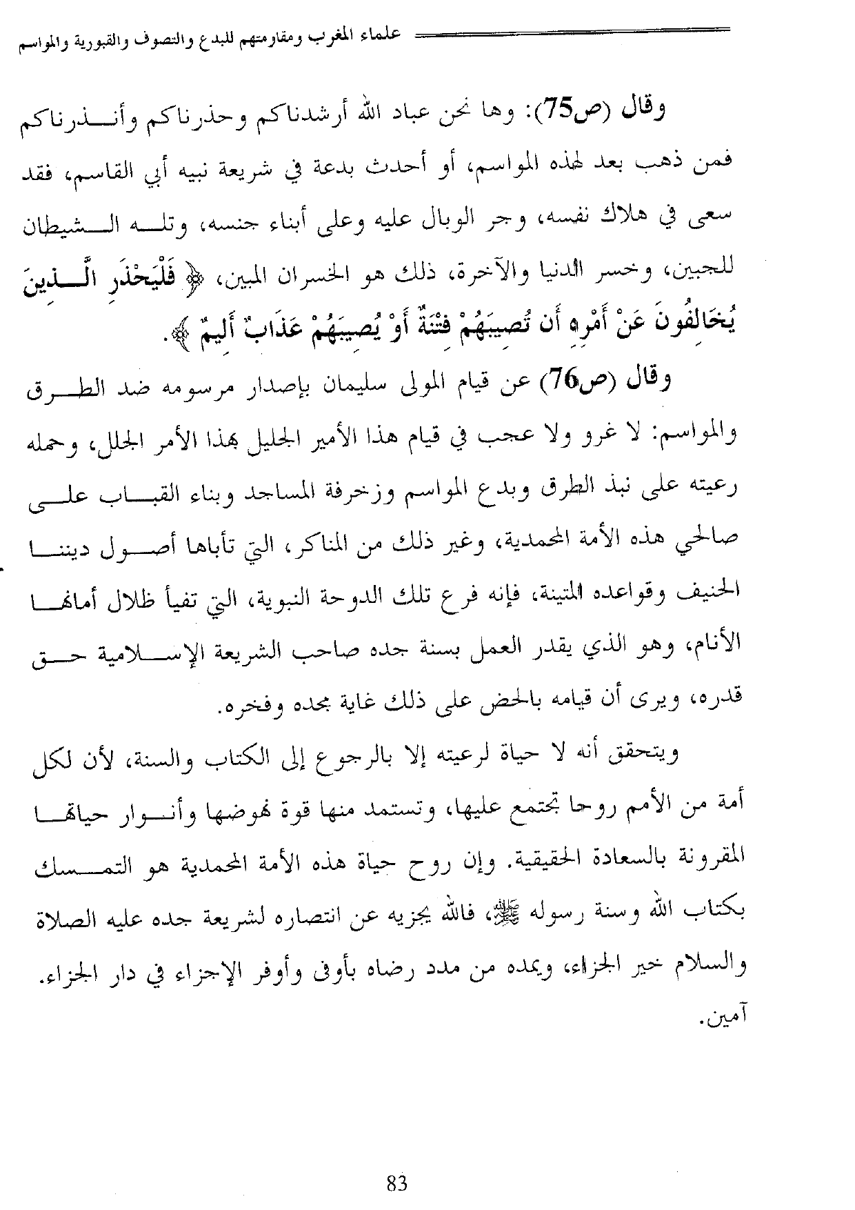 وقال (ص76) عن قيام المولى سليمان بإصدار مرسومه ضد الطرق والمواسم: لا غرو ولا عجب في قيام هذا الأمير الجليل بهذا الأمر الجلل، وحمله رعيته على نبذ الطرق وبدع المواسم وزخرفة المساجد وبناء القباب على صالحي هذه الأمة المحمدية، وغير ذلك من المناكر، التي تأباها أصول ديننا الحنيف وقواعده المتينة، فإنه فرع تلك الدوحة النبوية، التي تفيأ ظلال أمانها الأنام، وهو الذي يقدر العمل بسنة جده صاحب الشريعة الإسلامية حق قدره، ويرى أن قيامه بالحض على ذلك غاية مجده وفخره.