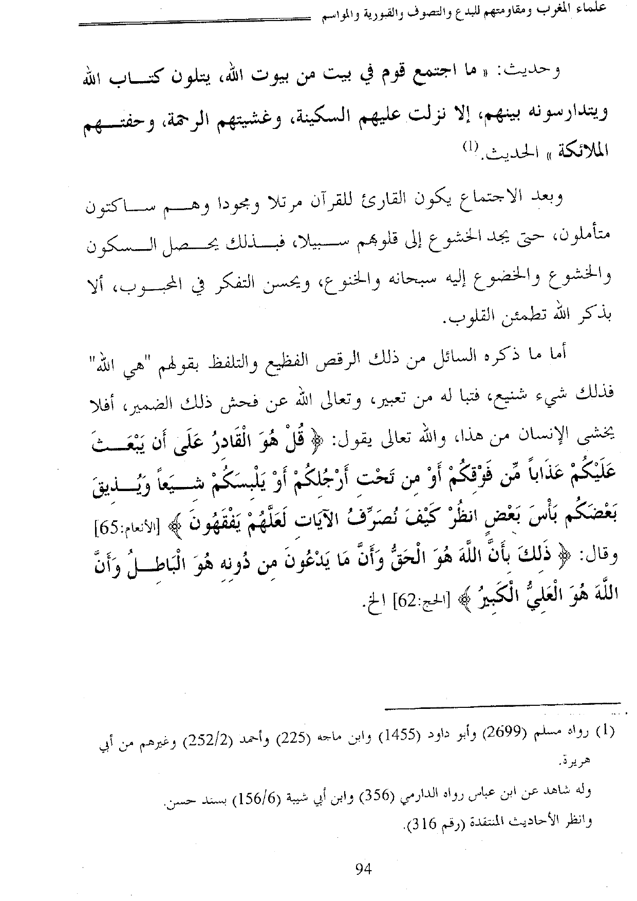 وحديث: «ما اجتمع قوم في بيت من بيوت الله، يتلون كتاب الله ويتدارسونه بينهم، إلا نزلت عليهم السكينة، وغشيتهم الرحمة، وحفتهم الملائكة» الحديث. (¬1)