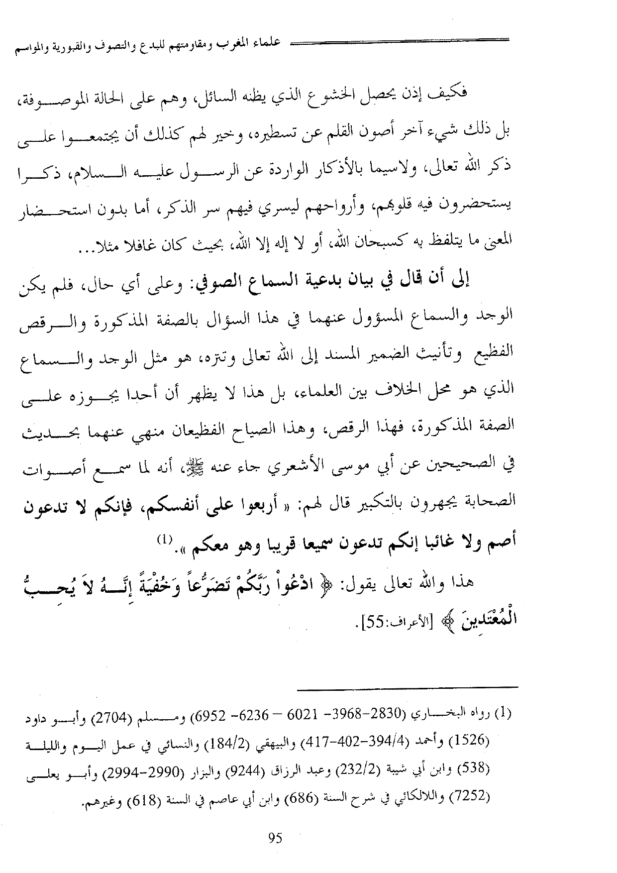 إلى أن قال في بيان بدعية السماع الصوفي: وعلى أي حال، فلم يكن الوجد والسماع المسؤول عنهما في هذا السؤال بالصفة المذكورة والرقص الفظيع وتأنيث الضمير المسند إلى الله تعالى وتنزه، هو مثل الوجد والسماع الذي هو محل الخلاف بين العلماء، بل هذا لا يظهر أن أحدا يجوزه على الصفة المذكورة، فهذا الرقص، وهذا الصياح الفظيعان منهي عنهما بحديث في الصحيحين عن أبي موسى الأشعري جاء عنه - صلى الله عليه وسلم -، أنه لما سمع أصوات الصحابة يجهرون بالتكبير قال لهم: «أربعوا على أنفسكم، فإنكم لا تدعون أصم ولا غائبا إنكم تدعون سميعا قريبا وهو معكم». (¬1)