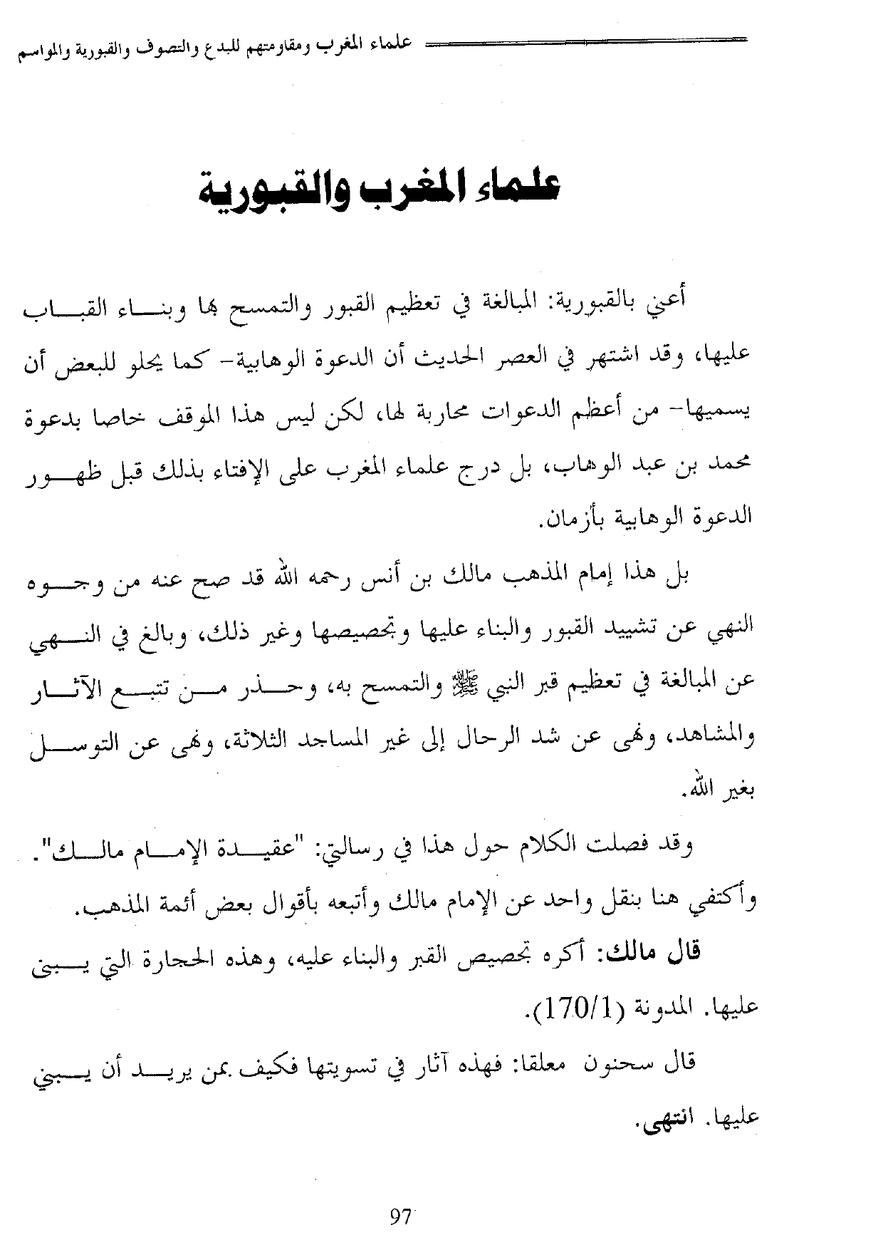 أعني بالقبورية: المبالغة في تعظيم القبور والتمسح بها وبناء القباب عليها، وقد اشتهر في العصر الحديث أن الدعوة الوهابية- كما يحلو للبعض أن يسميها- من أعظم الدعوات محاربة لها، لكن ليس هذا الموقف خاصا بدعوة محمد بن عبد الوهاب، بل درج علماء المغرب على الإفتاء بذلك قبل ظهور الدعوة الوهابية بأزمان.