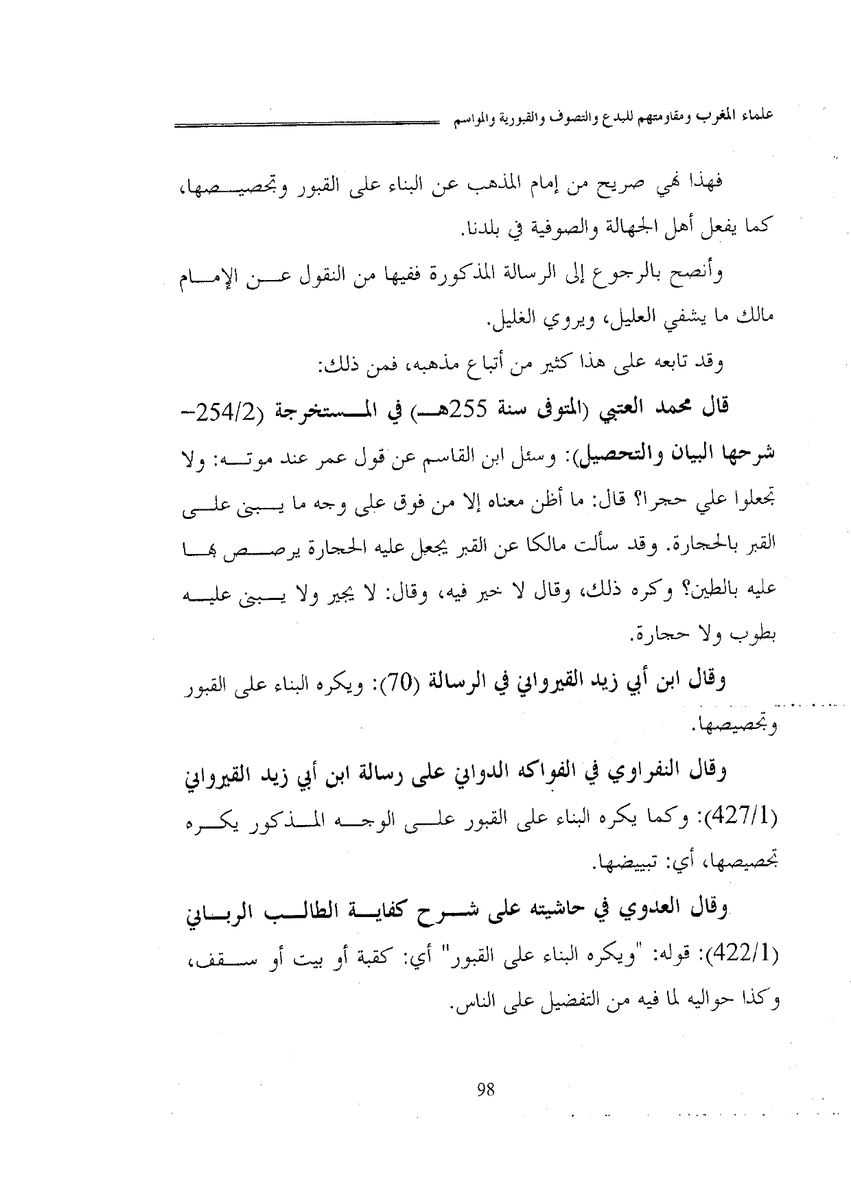 وقال ابن أبي زيد القيرواني في الرسالة (70): ويكره البناء على القبور وتجصيصها.