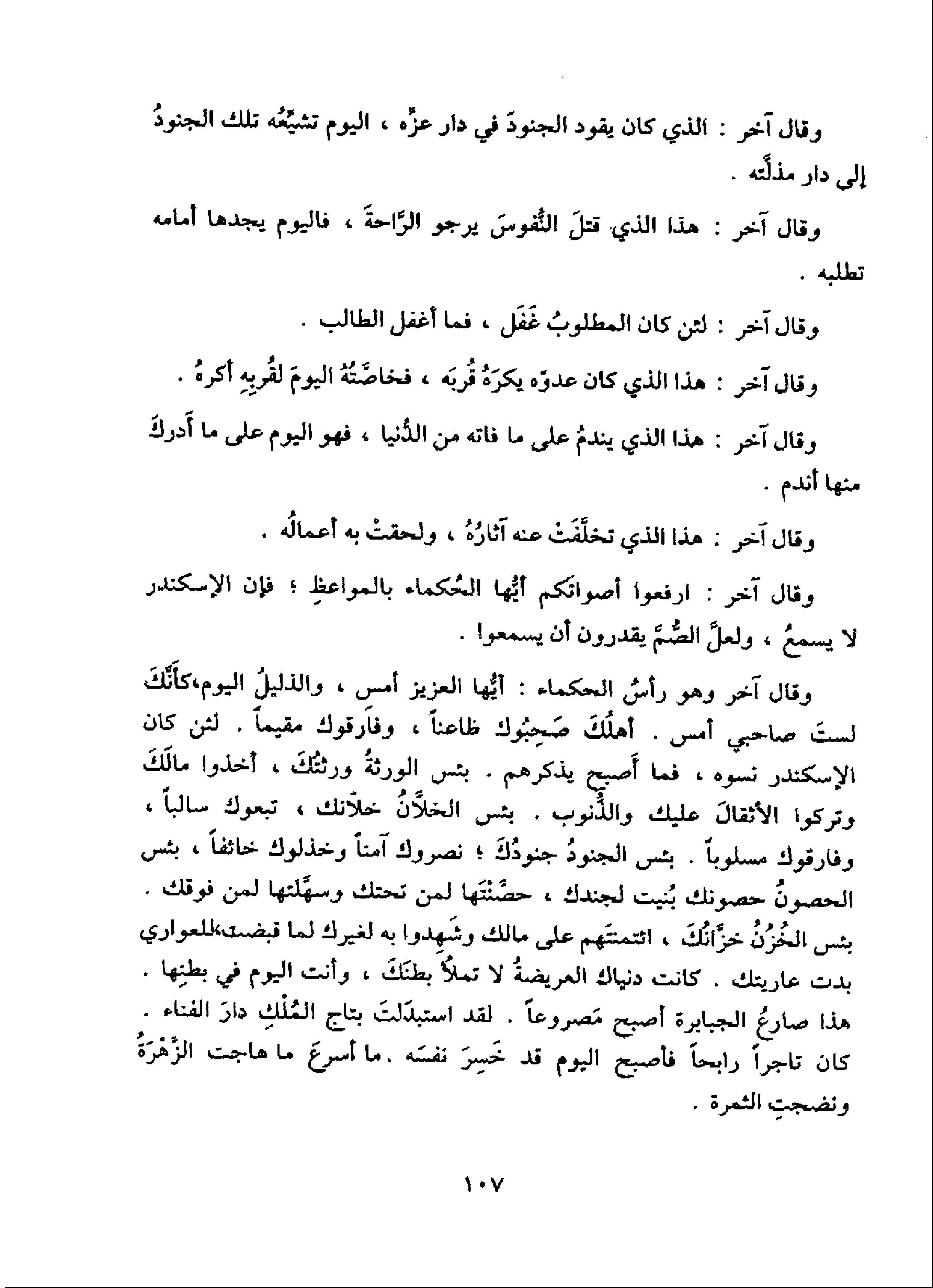 وقال آخر وهو رأس الحكماء: أيّها العزيز أمس، والذليل اليوم، كأنّك لست صاحبي أمس. أهلك صحبوك ظاعنا، وفارقوك مقيما. لئن كان الإسكندر نسوه، فما أصبح يذكرهم. بئس الورثة ورثتك، أخذوا مالك وتركوا الأثقال عليك والذّنوب. بئس الخلاّن خلاّنك، تبعوك سالبا، وفارقوك مسلوبا. بئس الجنود جنودك؛ نصروك آمنا وخذلوك خائفا، بئس الحصون حصونك بنيت لجندك، حصّنتها لمن تحتك وسهّلتها لمن فوقك.