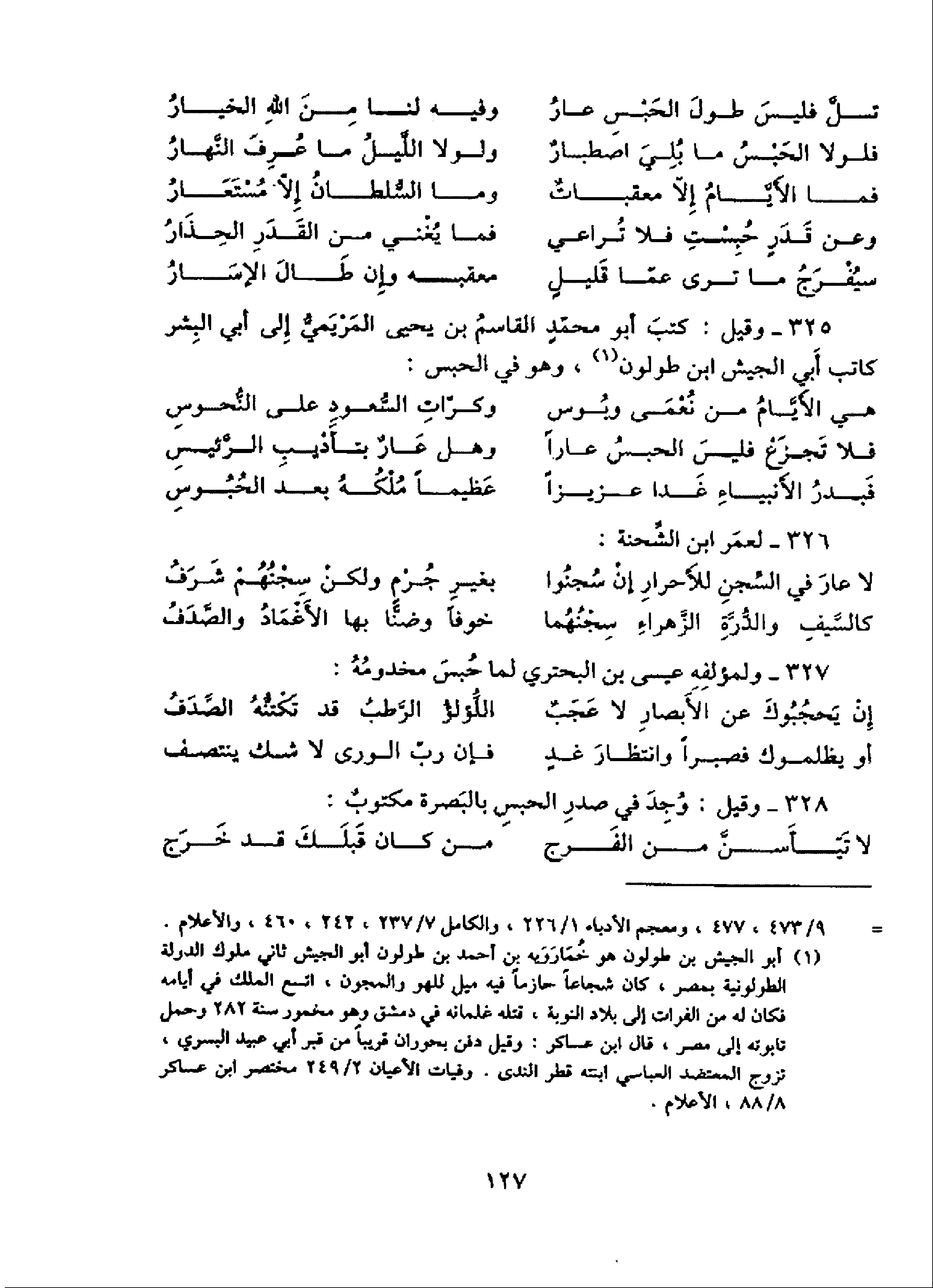 325 - وقيل: كتب أبو محمّد القاسم بن يحيى المريميّ إلى أبي البشر كاتب أبي الجيش ابن طولون (¬1)، وهو في الحبس: